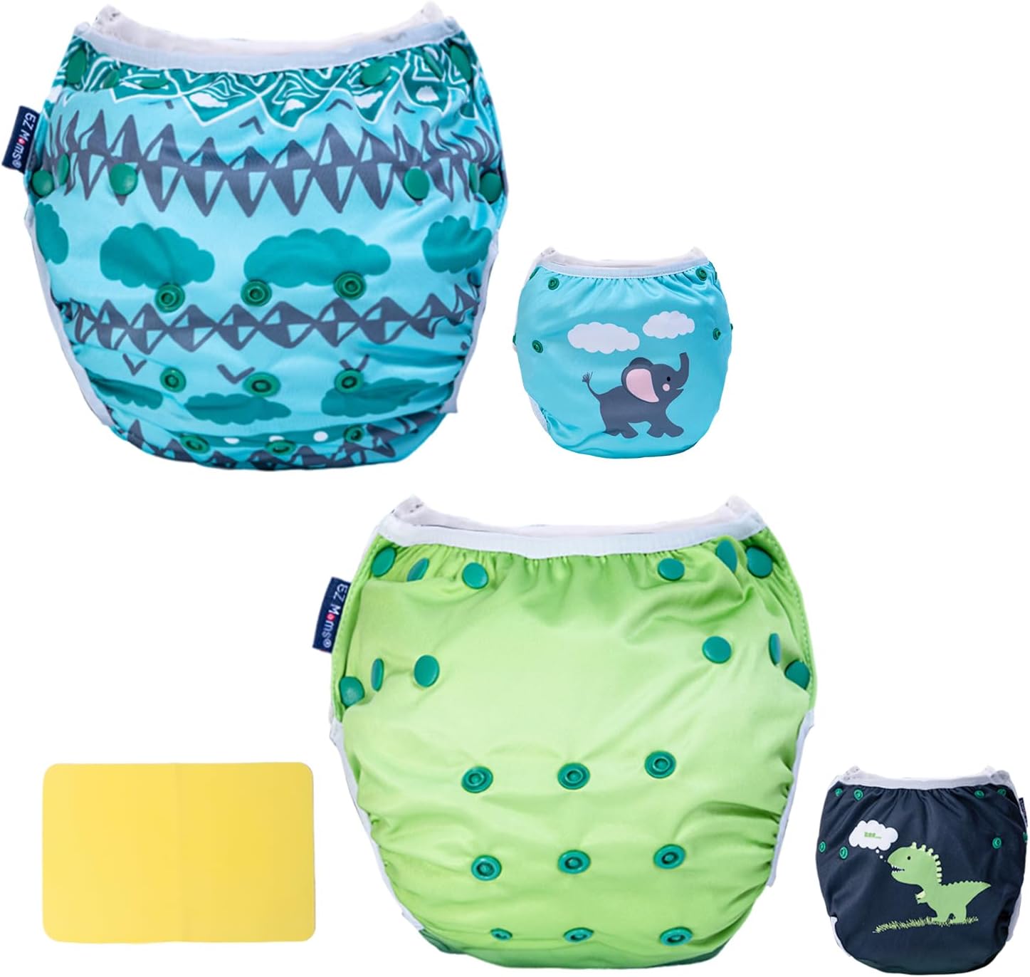 - Unique Design & Vibrant Color: Our newborn swim diaper combine gradient effects and localized prints, with distinct designs on both the front and back, showcasing EZ Moms dedication to creativity and detail. From playful whales, moons, dinosaurs, elephants, sailboats, to starfish, each reusable swim diapers 3t print is crafted to spark joy and imagination at every swim. The adjustable snaps of the water diapers flatter all body types, while the vibrant prints add a burst of color to pool time.