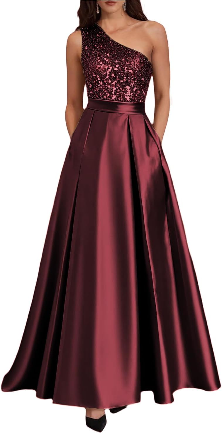 One Shoulder Prom Dresses Long Sequin Satin Mother of The Bride Dress for Women Formal Evening Gown with Pockets