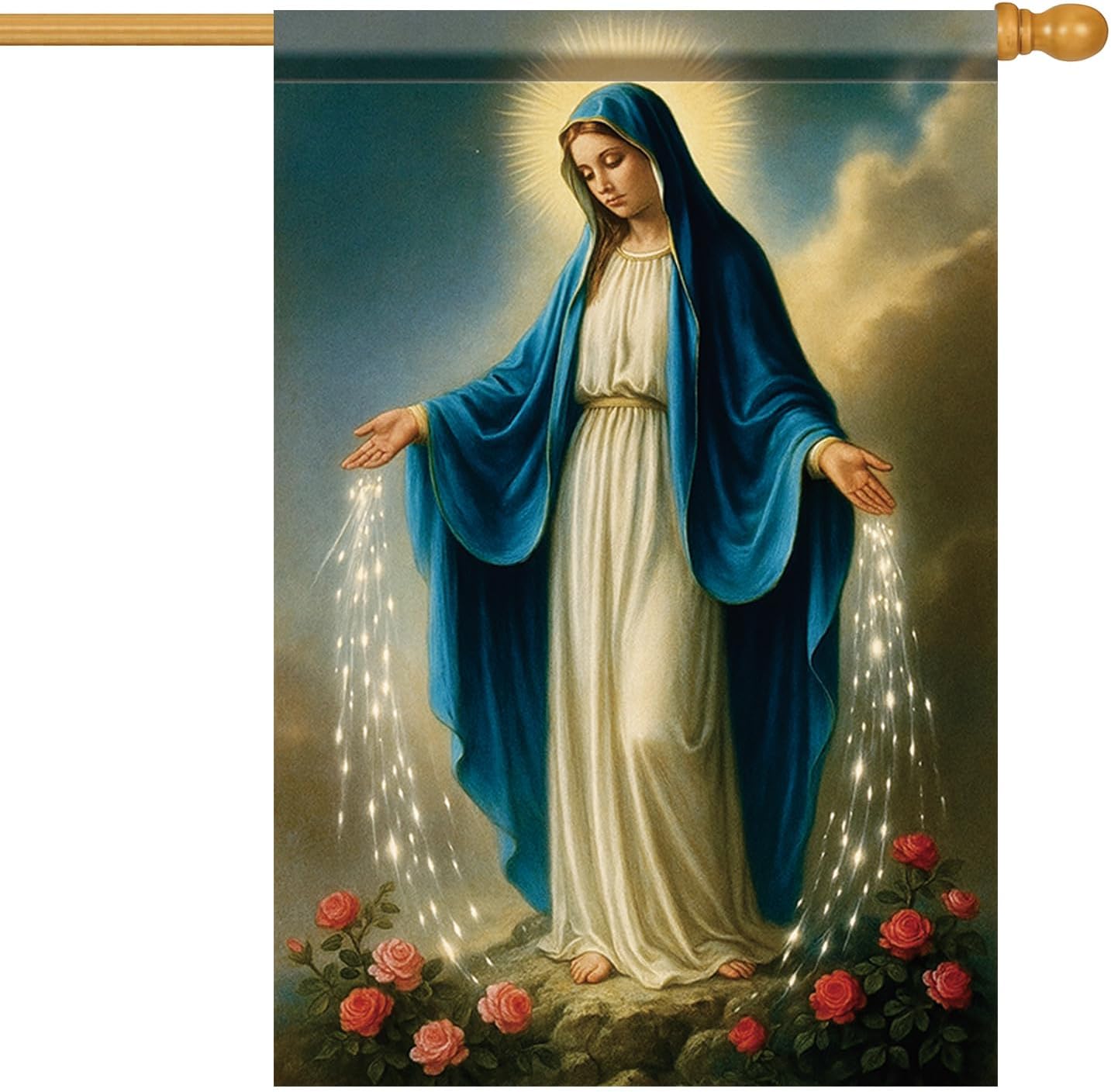Christmas Virgin Mary House Flag 28x40 Inch Double Sided Holy Mother Glowing Hands Blue Mantle Red Roses Nativity Scene Christian Religious Holy Night Winter Holiday Outdoor Yard Garden Porch Home Decoration