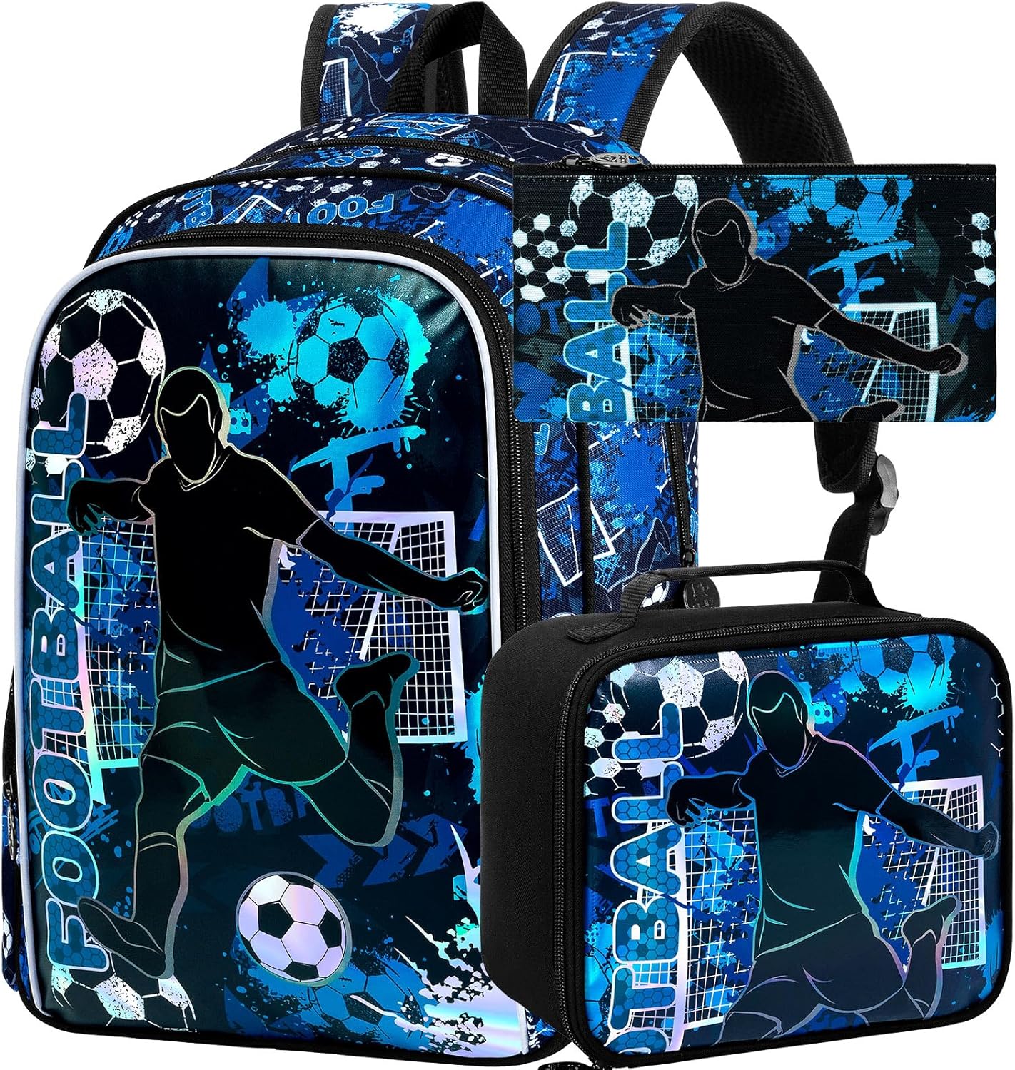 - Boys Backpack 3 in 1: The boys bookbag set with football UV printing, inclduing boy backpack: 17 "x 12" x 6 ", lunch box: 9.7 "x 8.5" x 4 ", pencil bag: 9 "x 4.7" x 0.5", ideal for primary and secondary school students.