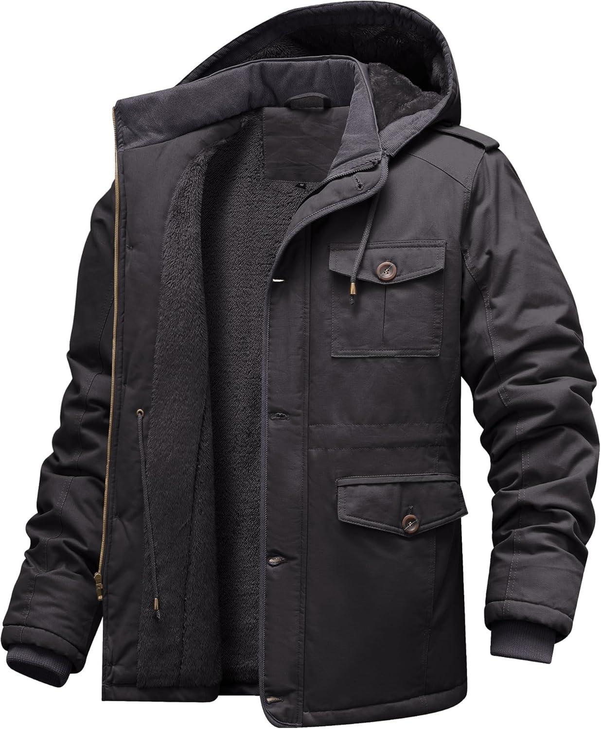 CHEXPEL Men's Winter Jackets with Hood Cotton Military Jackets Fleece Lined Thick Work Coats with Cargo Pockets