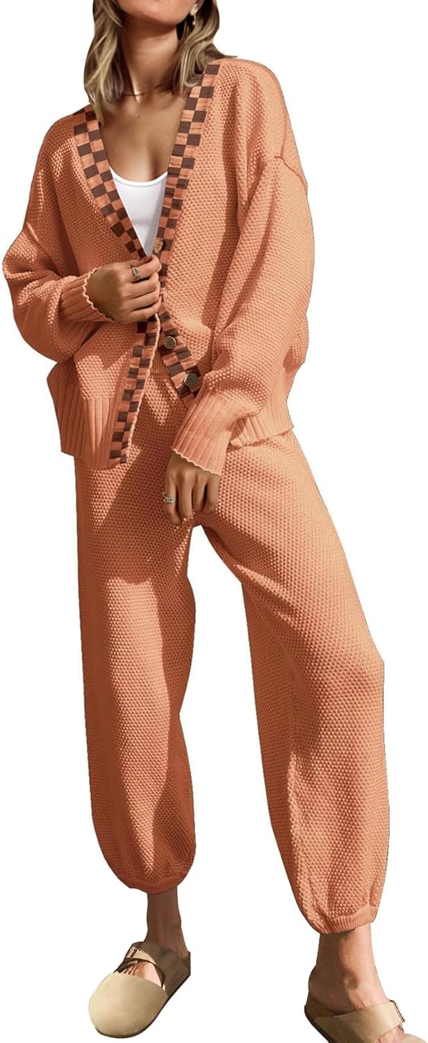 SAUKOLE Womens Two Piece Outfits Knit Sweater Sets Oversized Button Down Cardigan and Long Pants Matching Lounge Set