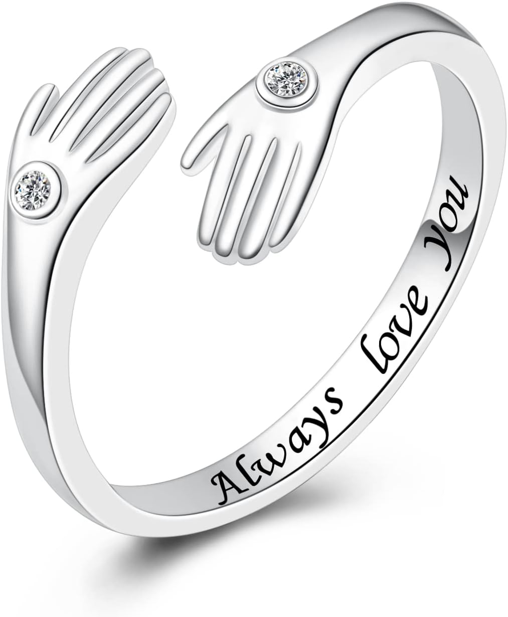Hug Ring for Women Adjustable, 925 Sterling Silver Hugging Hands Open Ring with Zircon, Always Love You Promise Jewelry Valentine's Mothers Day Gift for Her