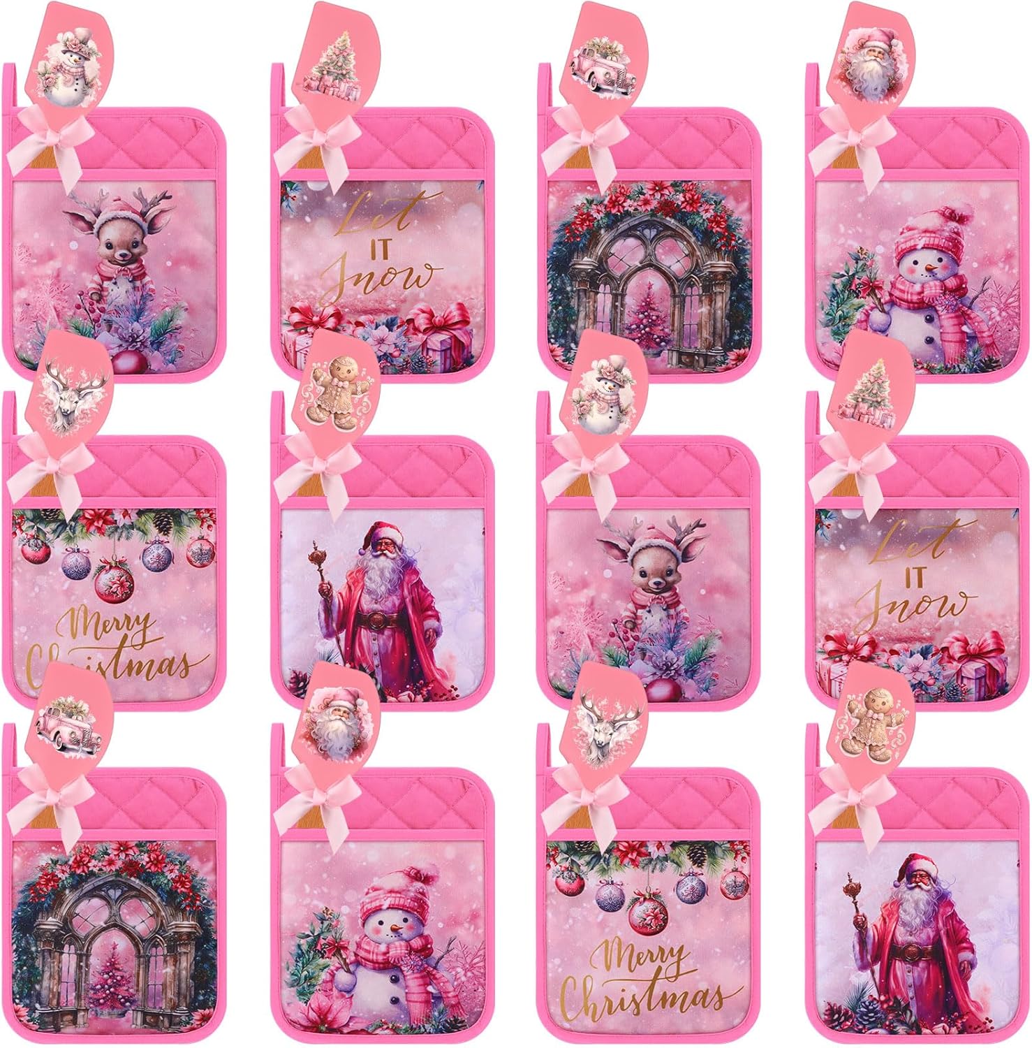 24 Pcs Pink Christmas Pot Holders and Silicone Spatula Gift Christmas Hot Pads with Pocket Xmas Scraper with Wooden Handle Heat Resistant Oven Mitt Cookie Bag for Baking Cooking(Cute)
