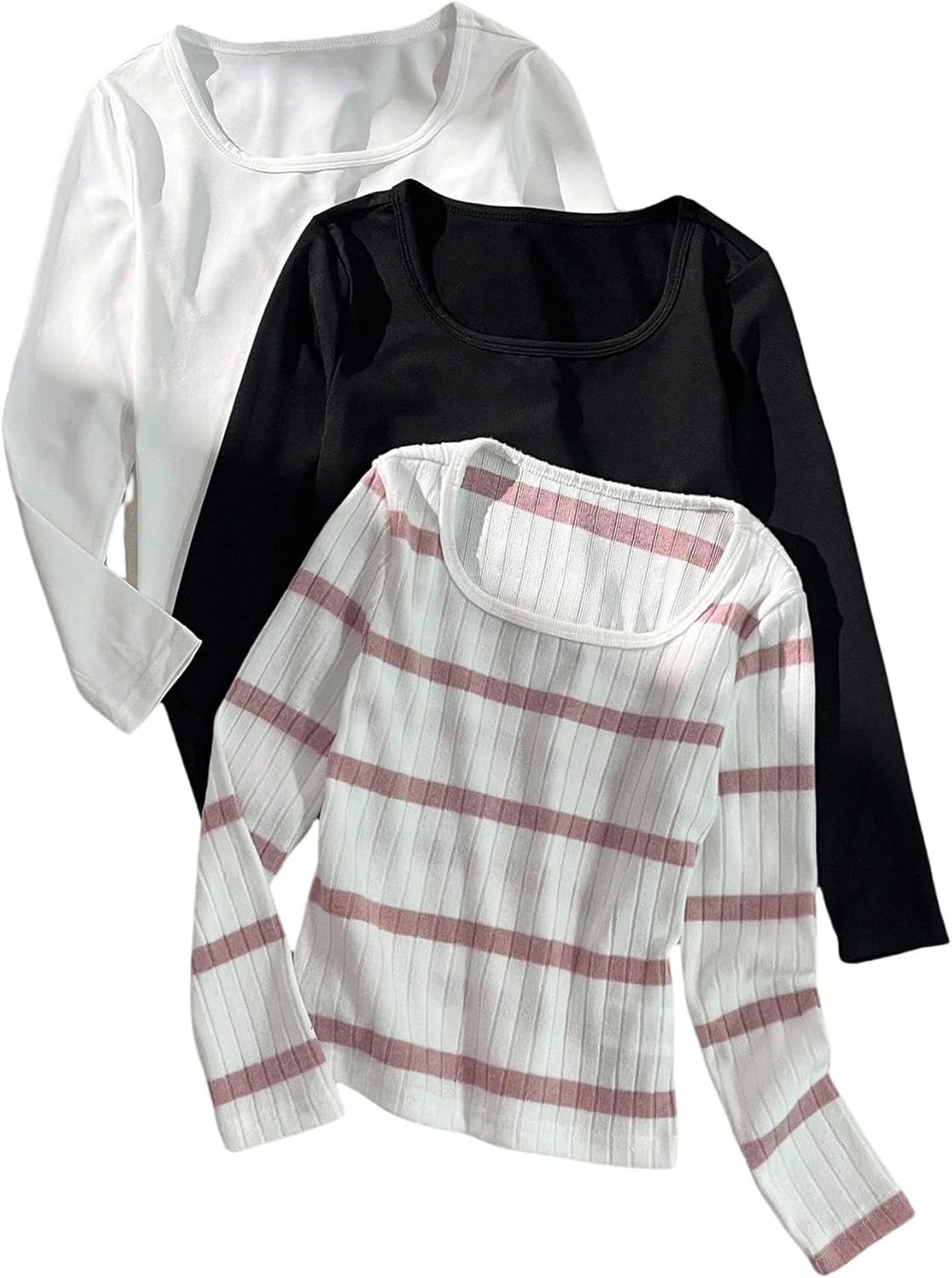 Girl's 3 Piece T Shirts Set Ribbed Knit Square Neck Long Sleeve Tops Sets