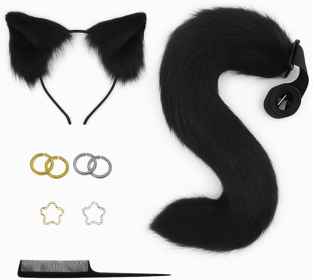 Fluffy Cat Fox Wolf Ears and Tail Set – Faux Fur Animal Headband and Tail for Cosplay, Halloween, Anime Outfits