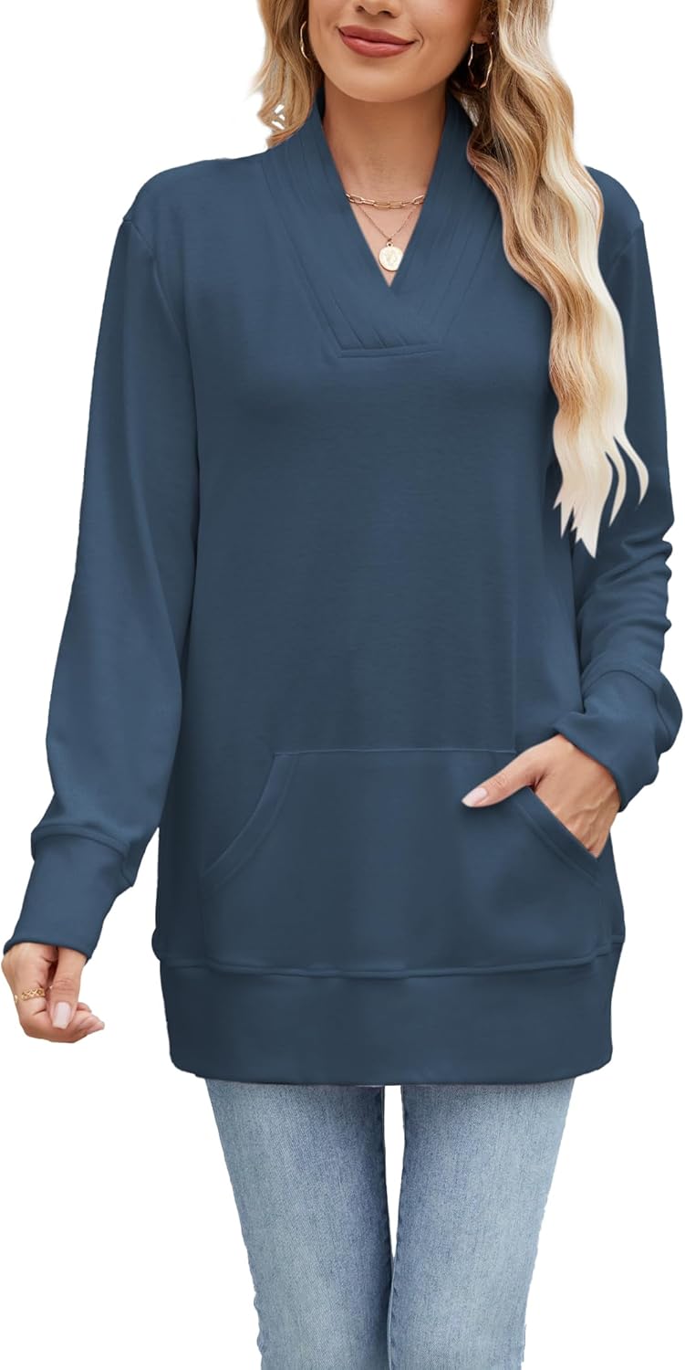 Famulily Womens Long Sleeve Pleated V Neck Sweatshirts Casual Loose Tunic Tops with Kangaroo Pocket