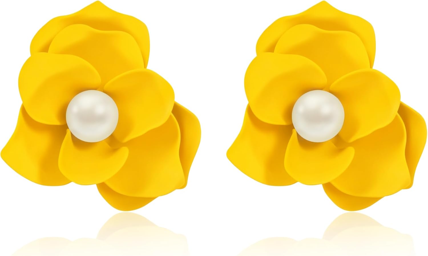 FILMOON Yellow Floral Earrings for Women 3D Flower Statement Stud Earrings with Pearl Center Oversized Studs Spring Summer Boho Jewelry