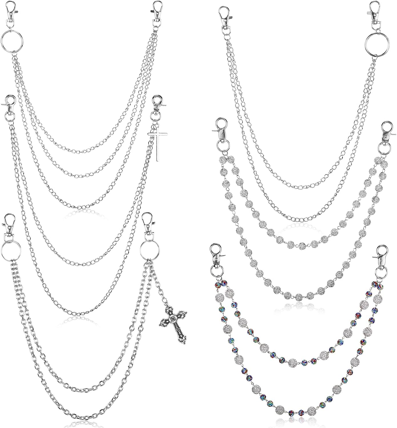 Quelay 6 Pcs Goth Pants Chain Punk Jean Pocket Chains Sparkly Ceramic Beads Wallet Chain Belt Silver Multi Layer Key Hip Hop Chains for Women Men Accessories
