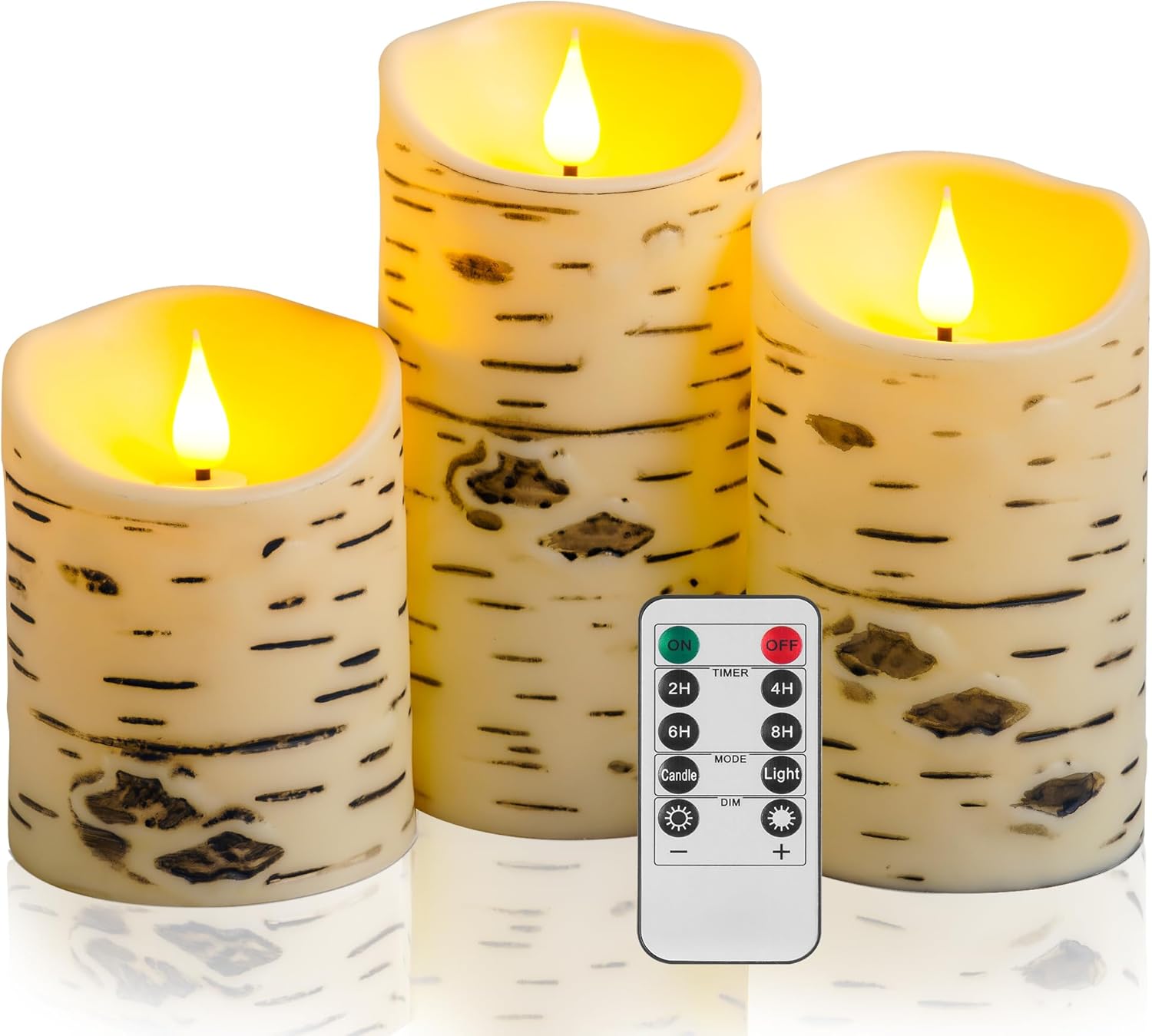 Flameless Birch Bark Candles Flashing Battery Operated Candles LED Pillar Candles with Remote Control and Timer Set of 3