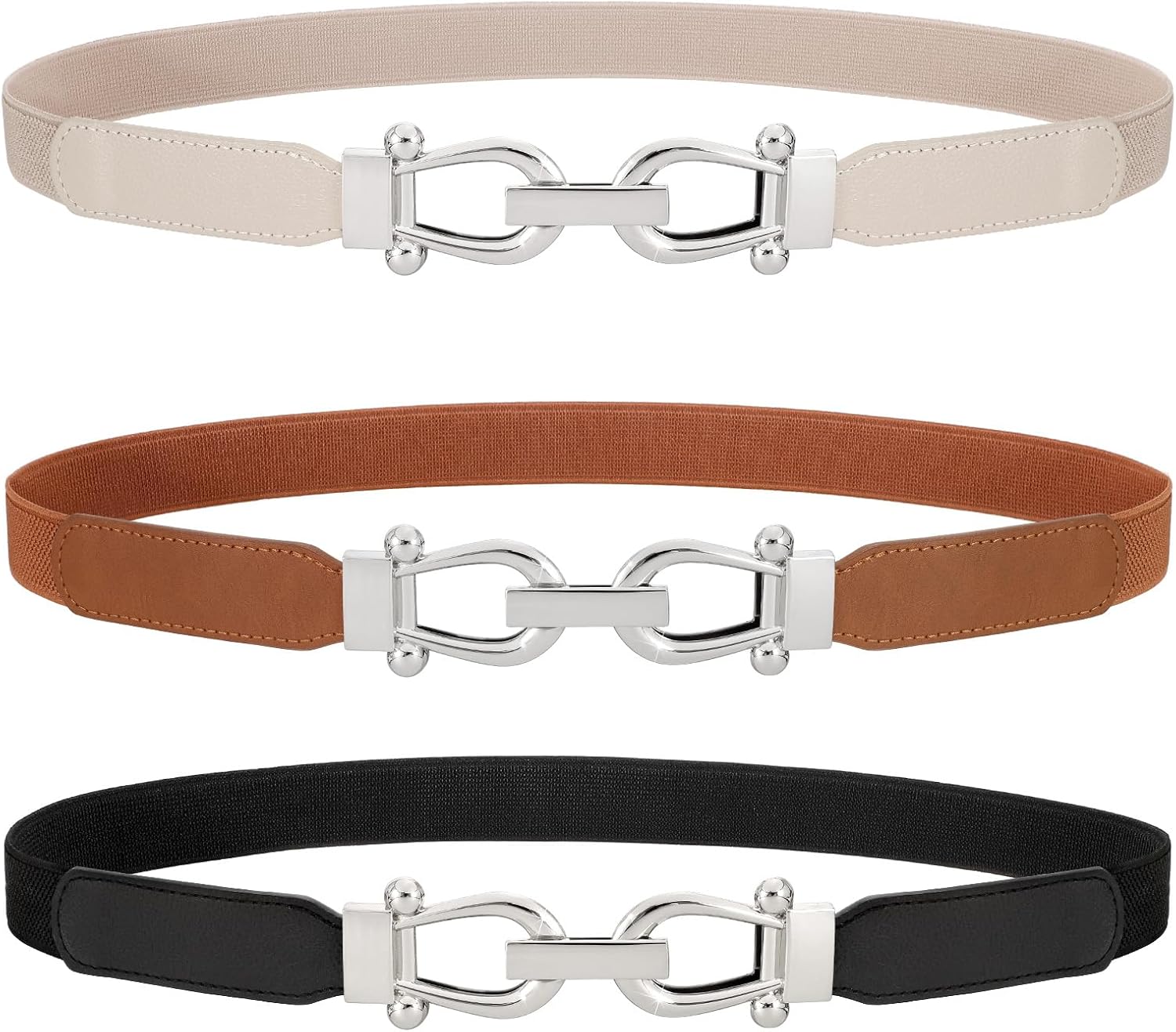 WERFORU 3 Pack Women Skinny Elastic Waist Belt Gold Buckle Stretchy Thin Belt for Jeans Dress