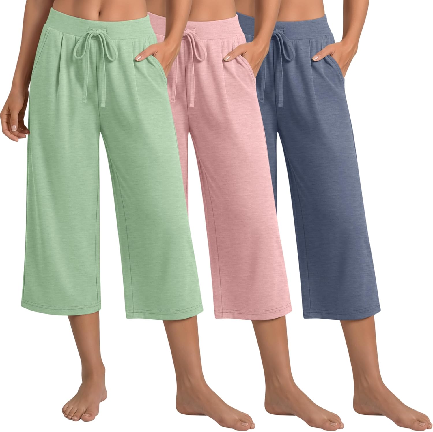 3 Pack Women's Capri Pants, Casual Wide Leg Yoga Pants High Waist Drawstring Cropped Lounge Trousers with Pockets