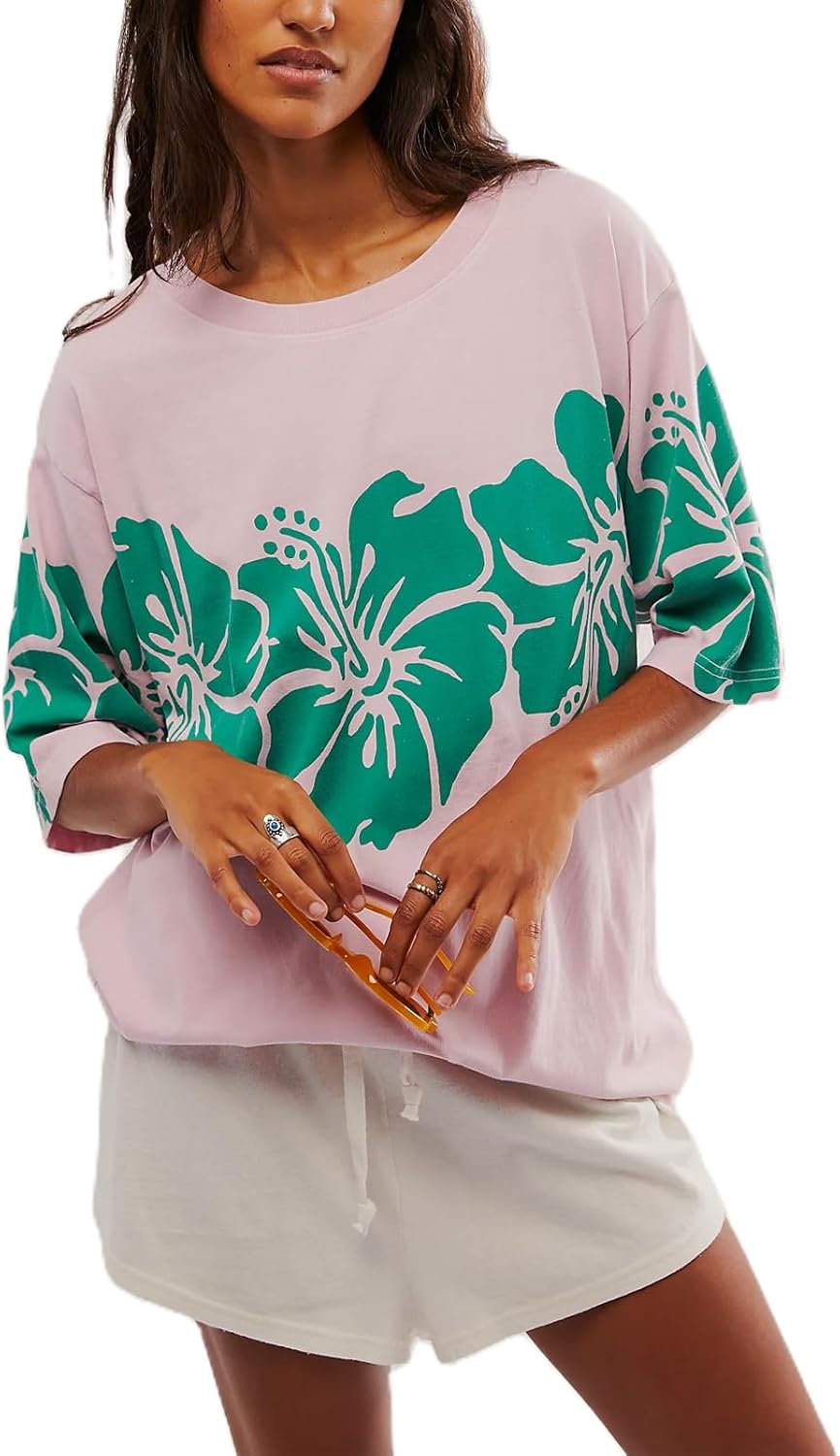 Womens Oversized Vintage Flower Graphic Tees Tops Y2k California Aesthetic Baggy T-Shirts Fruit Coastal Summer