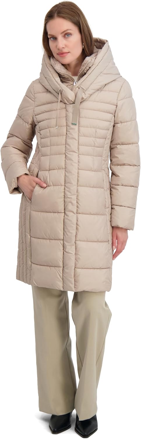 TAHARI Women's Slim Fit Puffer Coat With Attached Hood, Faux Fur Collar, Interior Bib & Hand Warmer Pockets
