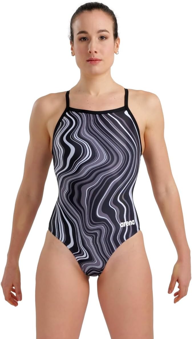 ARENA Performance Marbled Women's Swimsuit Light Drop Back One Piece MaxLife Pool Training Bathing Suit Athletic Sports Swimwear, Black/Black Multi, US Size 30
