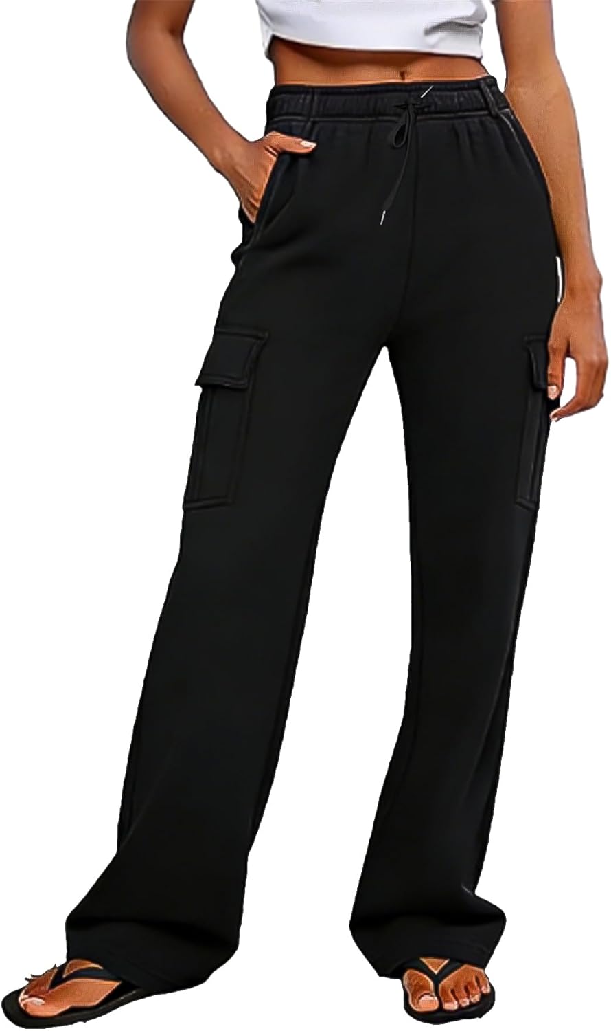 Flamingals Women's Straight Leg Pants Elastic Waisted High Rise Sweatpants with Flap Pockets Casual Pull-On Pants