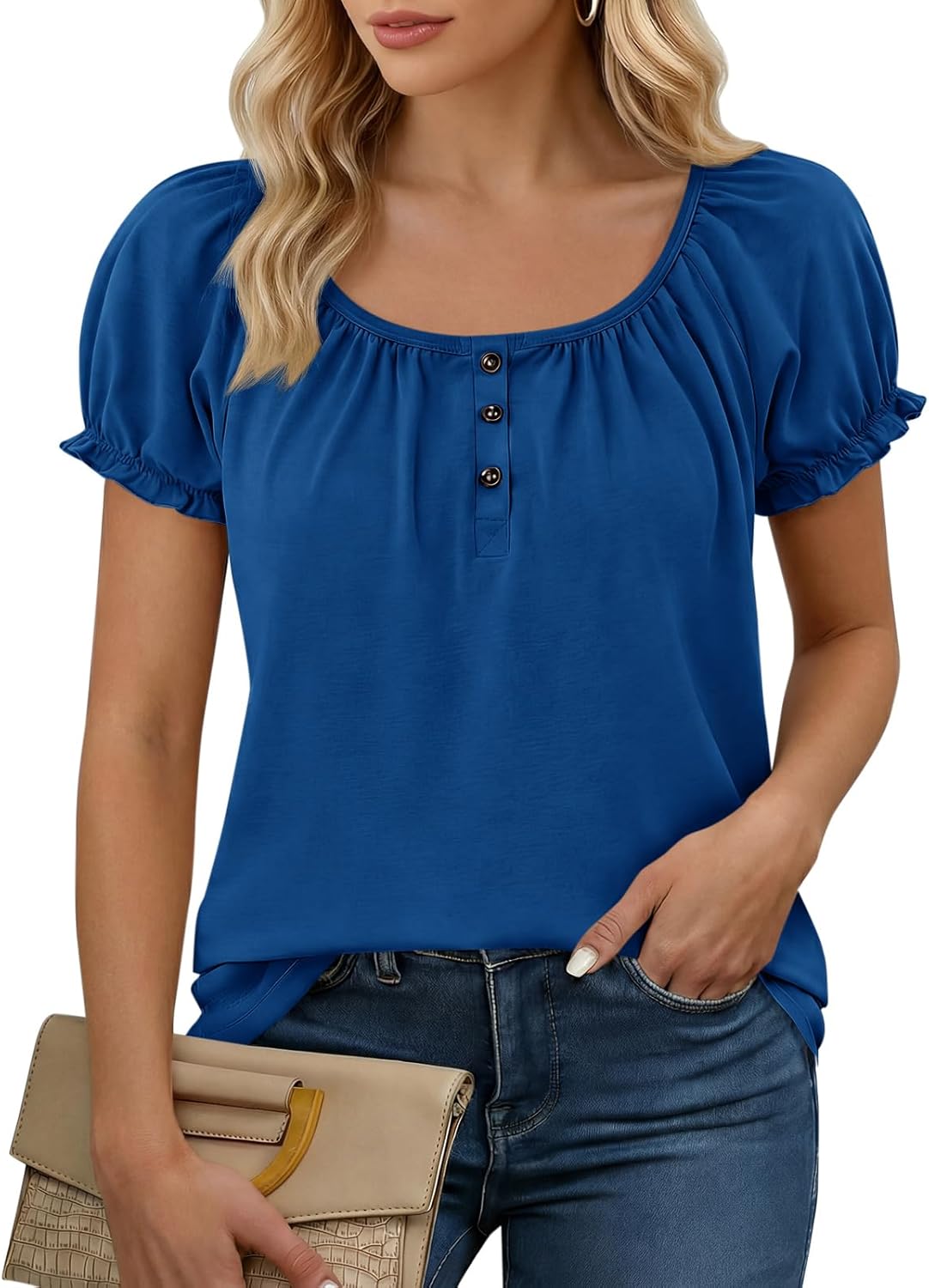 Tankaneo Womens Short Sleeve Shirts Puff Ruffle Sleeve Scoop Neck Pleated Tops Summer Casual Loose Fit Henley Shirt