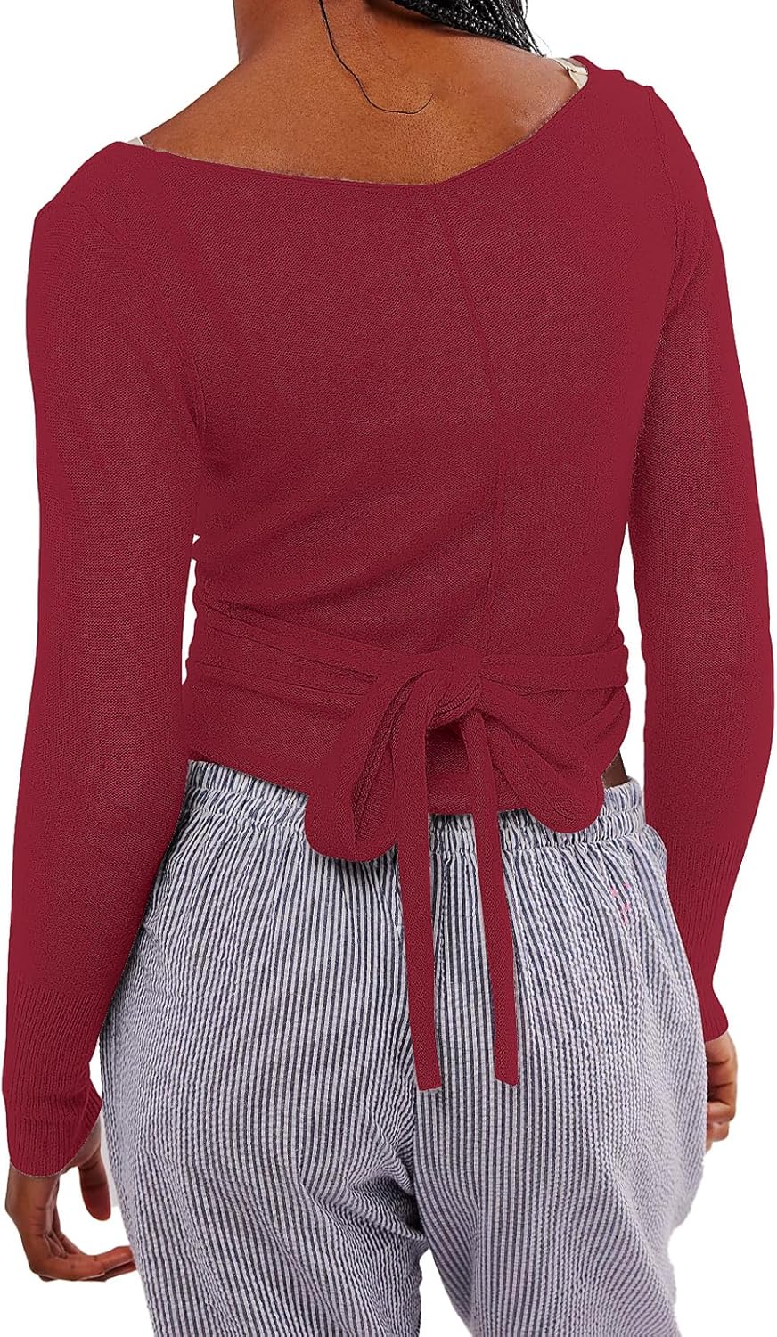 Womens Wool Tie Front Tops Crop Top Solid Long Sleeve Solid V-Neck Lightweight Crochet Cardigan Crop