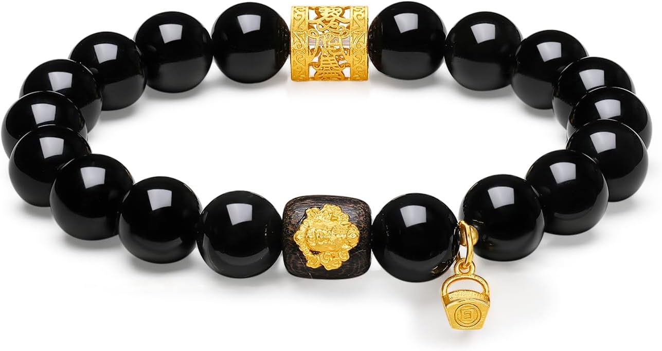 Sterling Silver Bracelet Silver Obsidian Stone Agarwood Stretch Bracelet Openwork with Lock Charm Beaded Bracelet for Women Mom Daughter Birthday 6.7" J1916256