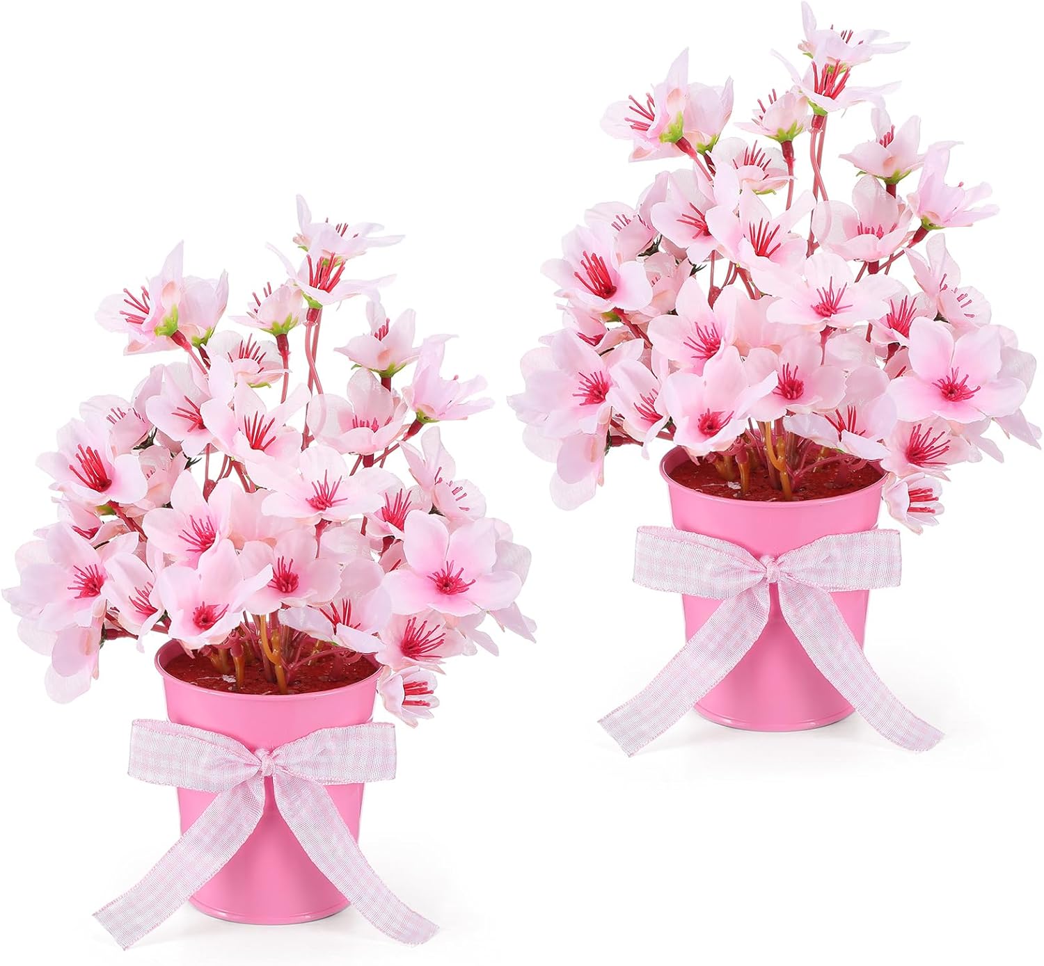 - Cherry Blossom Plant: the Potted artificial cherry blossom branches feature delicate and realistic petal textures and a pink bucket, complemented by a pink checkered bow, providing visual tranquility and mental relaxation; The artificial plants and simulated flowers require little maintenance and are suitable for almost any room in the home, including dining rooms, offices, bathrooms, foyer rooms, and kitchens; It is an ideal choice for enhancing the quality of life