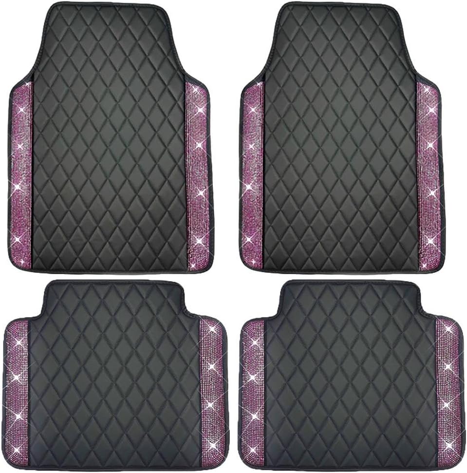 Universal Car Floor Mats,Faux Black Leather with Pink Diamond Carpet Glitter Crystal Rhinestones All Weather Waterproof Auto Liners Foot Pads Set