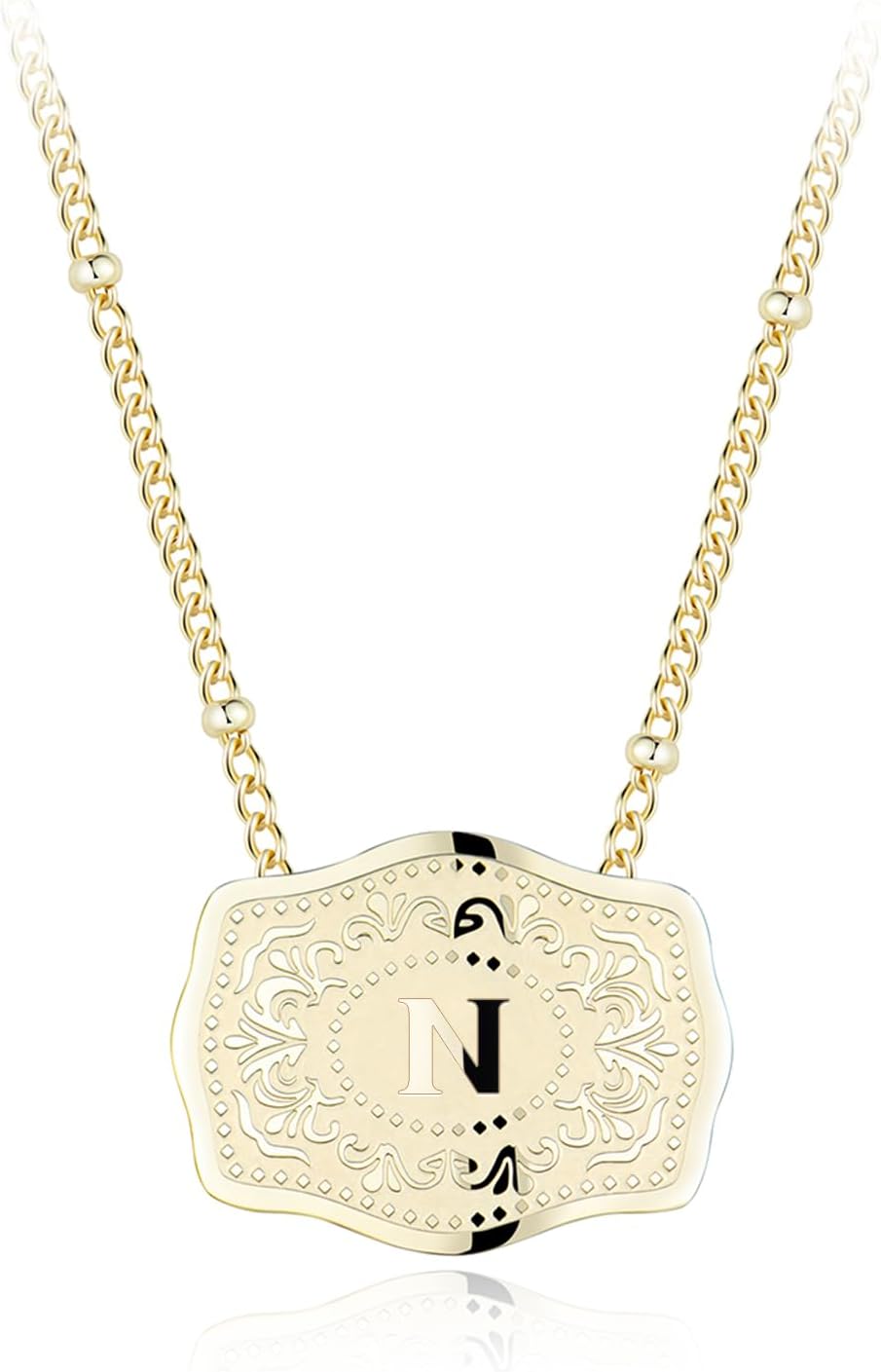 14K Gold-Plated Initial Letter Pendant Necklace with Embossed Belt Buckle, Buy 1 Get 2 Chains, Personalized Necklace for Women and Men