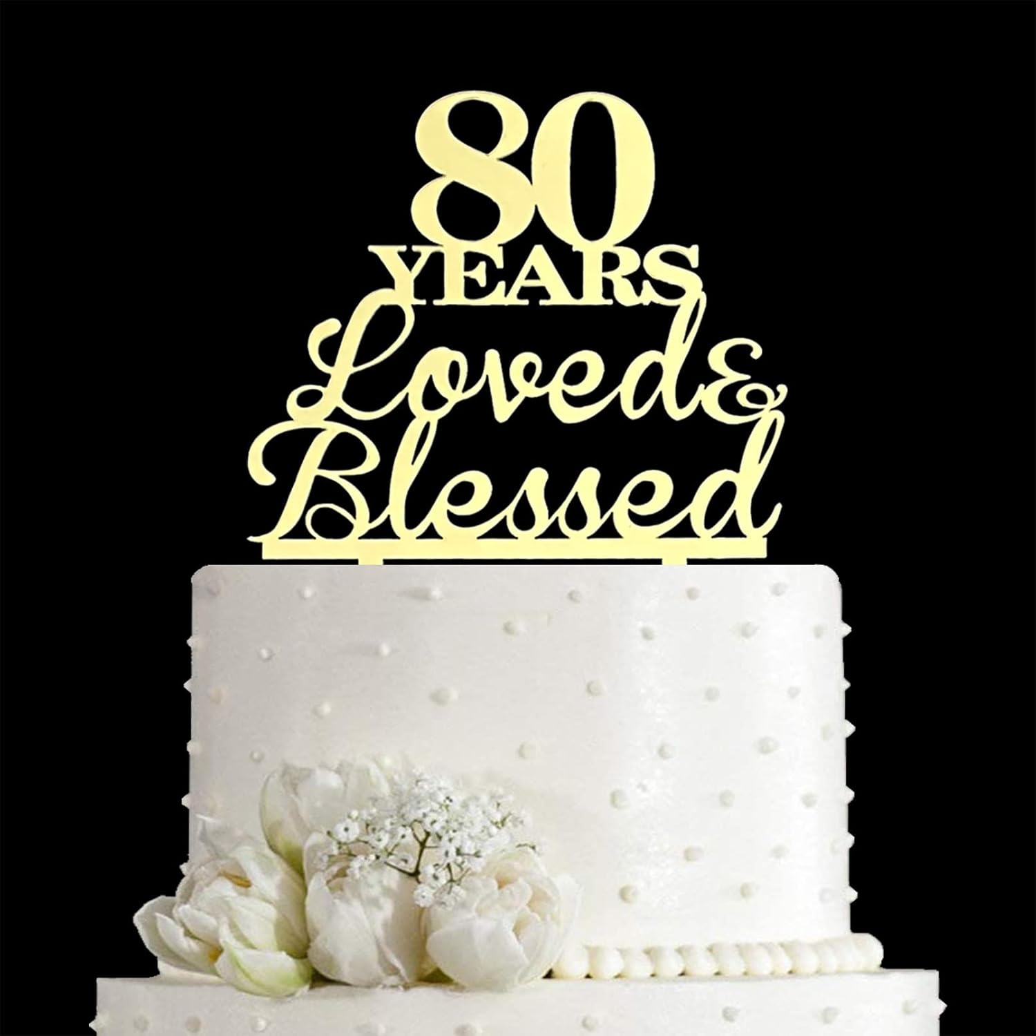 JIEEIN 80 Years Loved & Blessed Cake Topper - 80th Birthday, Wedding Anniversary Party Decorations - Mirror Gold Acrylic