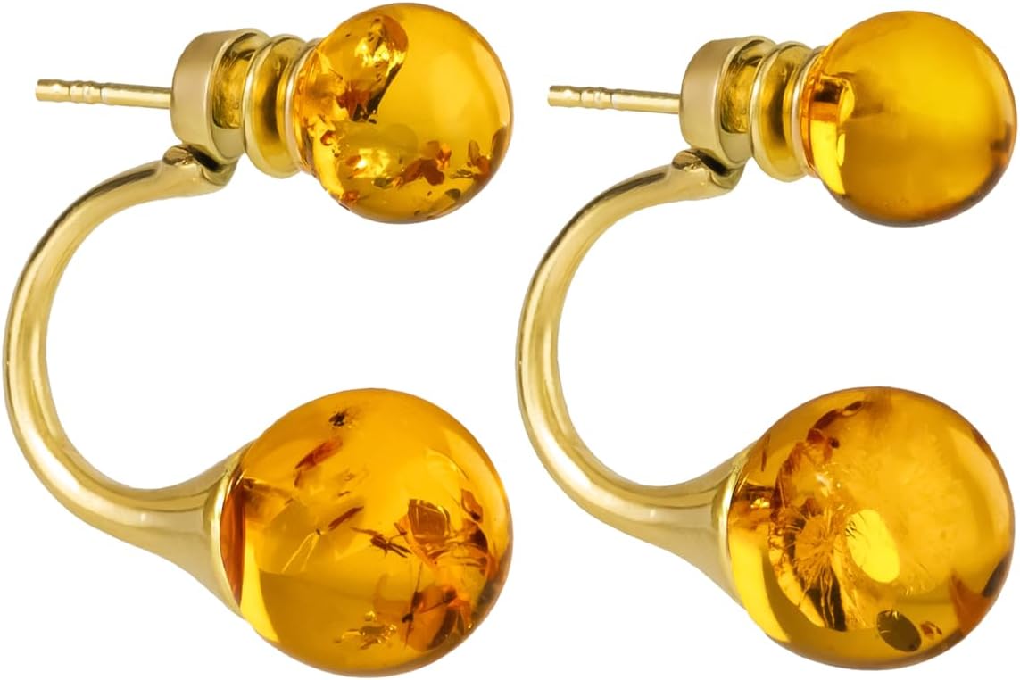 Stud Earrings for Women - 24K Gold Plated Silver, Double Ball Design Earrings with Natural Baltic Amber Pieces, Lightweight Jewelry Gift for Everyday Elegance