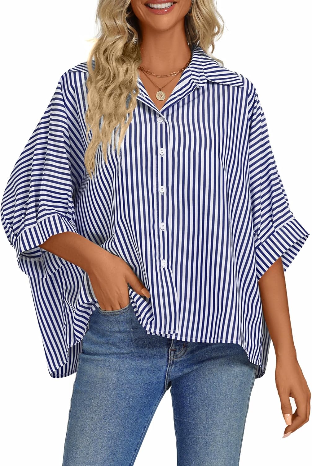 Vrtige Women's Casual Stripe Button Down Collar V Neck Half Sleeve Loose Blouse Shirt Top
