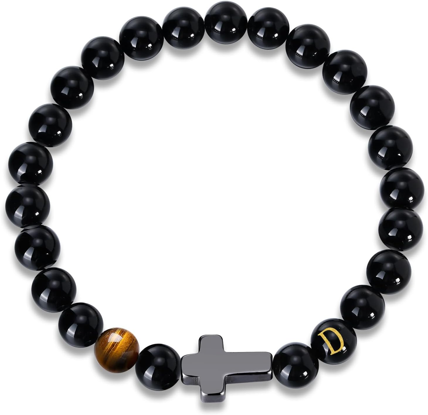Mens Cross Bead Bracelet with Initials, Christian Rosary Obsidian A-Z Letter Black Onyx Tigers Eye Beaded Bracelet, Faith Religious Easter Catholic Communion Baptism Christmas Jewelry Gift for Men