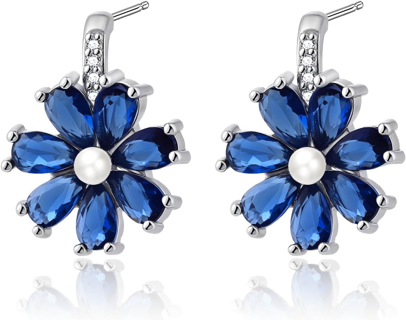 Vintage Silver Flower Birthstone Earrings - Hypoallergenic Dangle Drop Floral Earrings with Pearl, Trendy Birthstone Crystal Jewelry Gift for Women