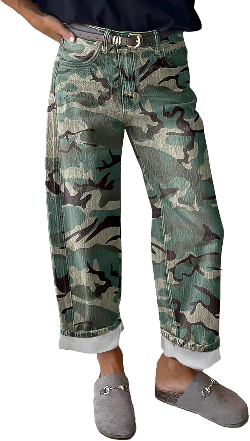 Flamingals Camo Straight Leg Pants for Women Mid Rise Baggy Casual Pants Without Belt