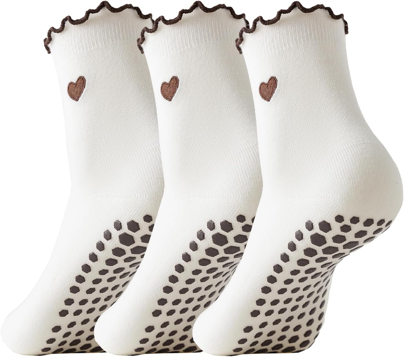 3 Pairs Pilates Socks with Grips Non-slip Ruffle Cute Heart Yoga Grip Sock for Women