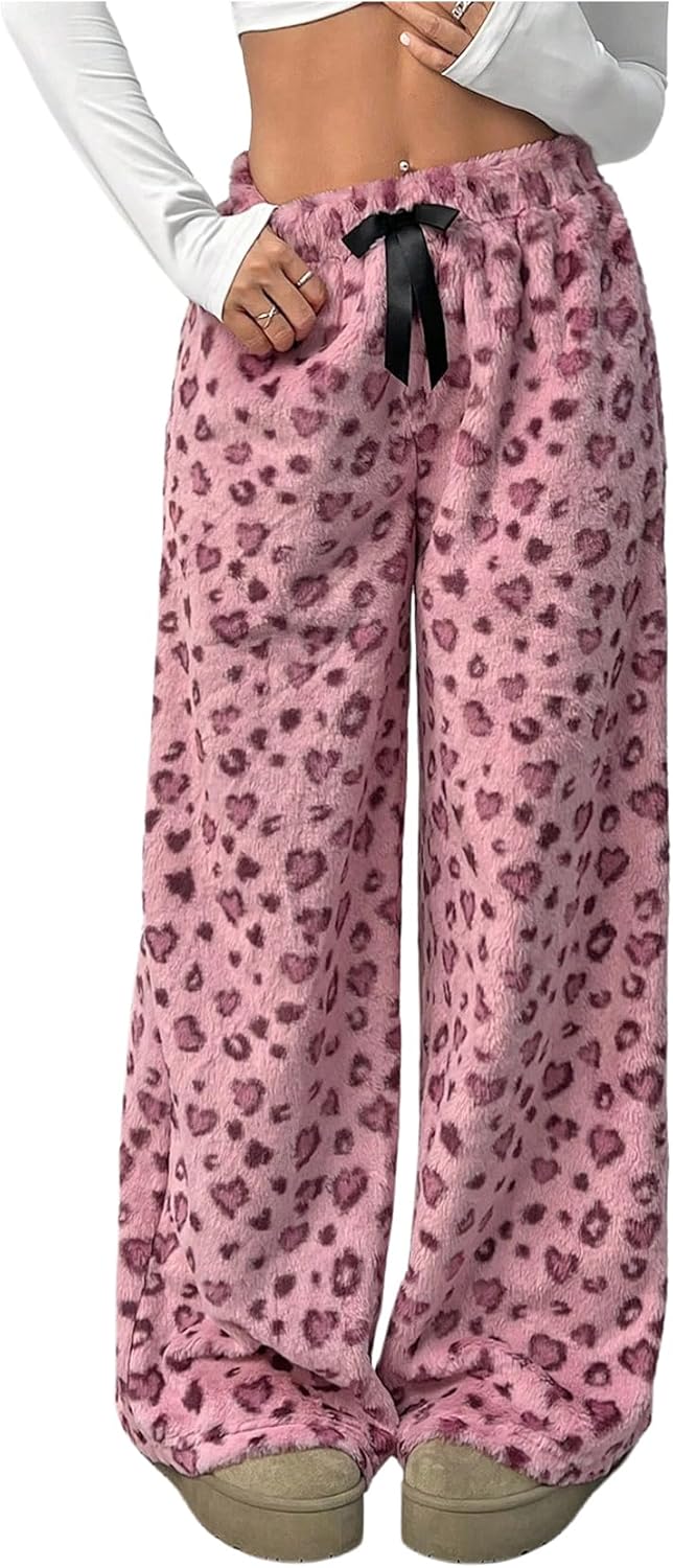 SHENHE Women's Fuzzy Leopard Print Pajama Pants Wide Leg Baggy Y2k Plush Lounge Trousers