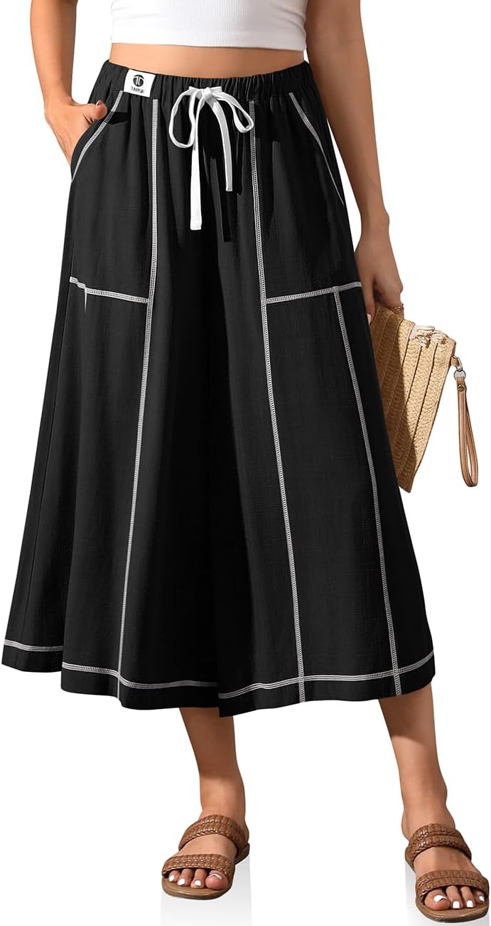 TARSE Womens Linen Skirt Pants Wide Leg Capri Culottes Boho Summer Casual Vacation Palazzo Pants with Pocket