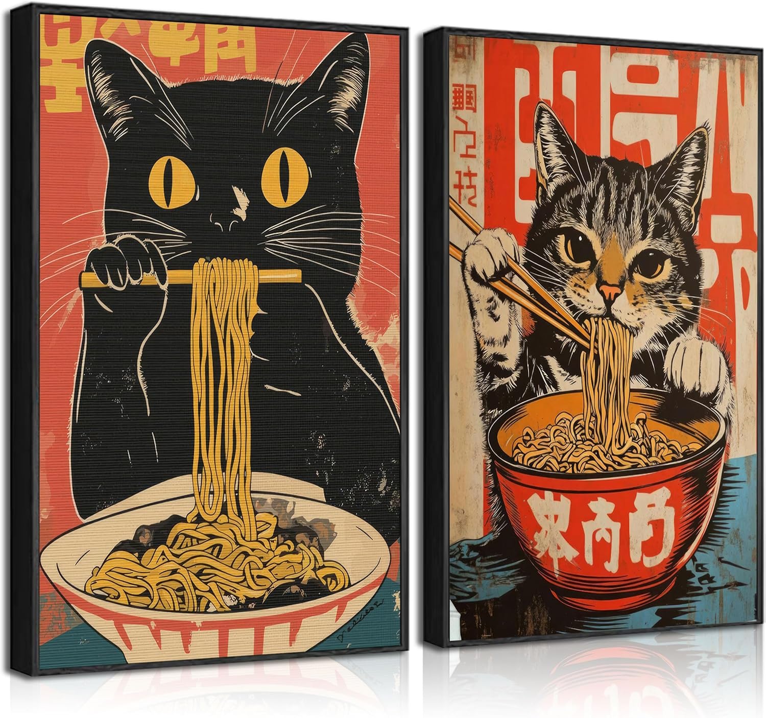 - 【Japanese Cat Wall Art】: Each canvas painting measures 16" x 12" and includes two designs, black cat and tabby cat, which vividly present the fun scene of cats enjoying ramen. The retro portrait collage style is matched with pop art colors to inject vitality into the wall.