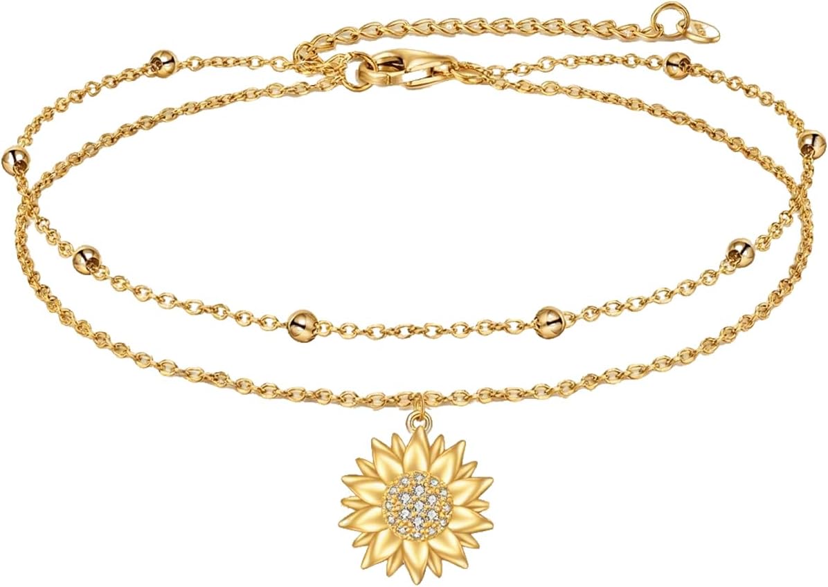 KECHO 14k Yellow Gold Sunflower Anklet Bracelet for Women Double Layer Gold Jewelry Gifts for Her