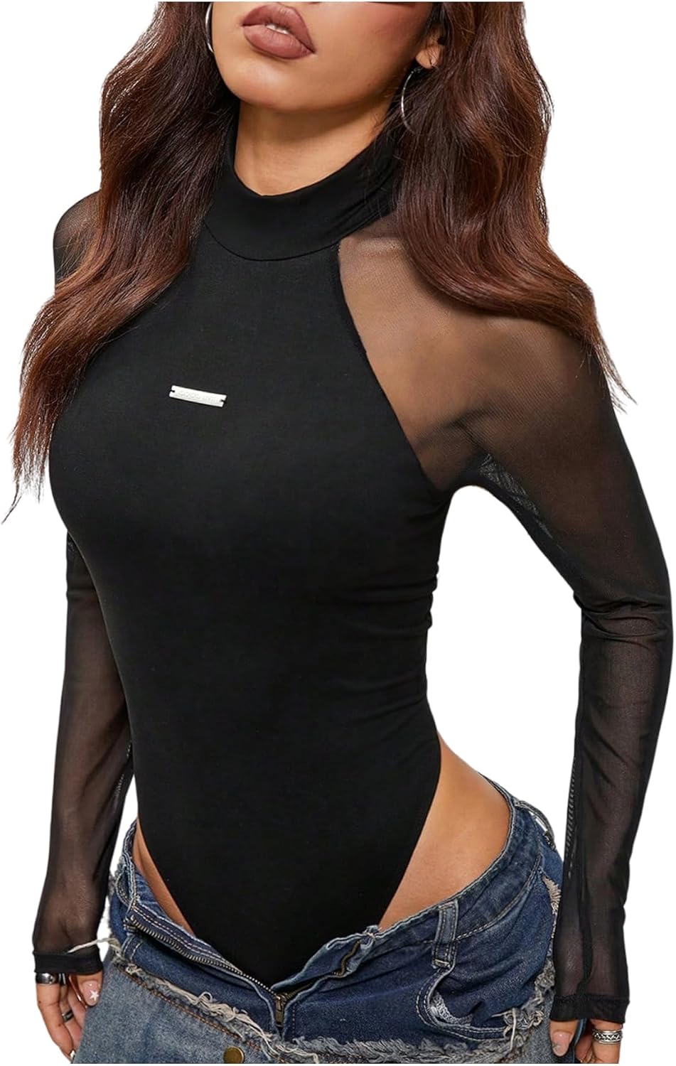 Women's Sheer Mesh Bodysuits Mock Neck Long Sleeve Fitted Body Suit Tops Shapewear