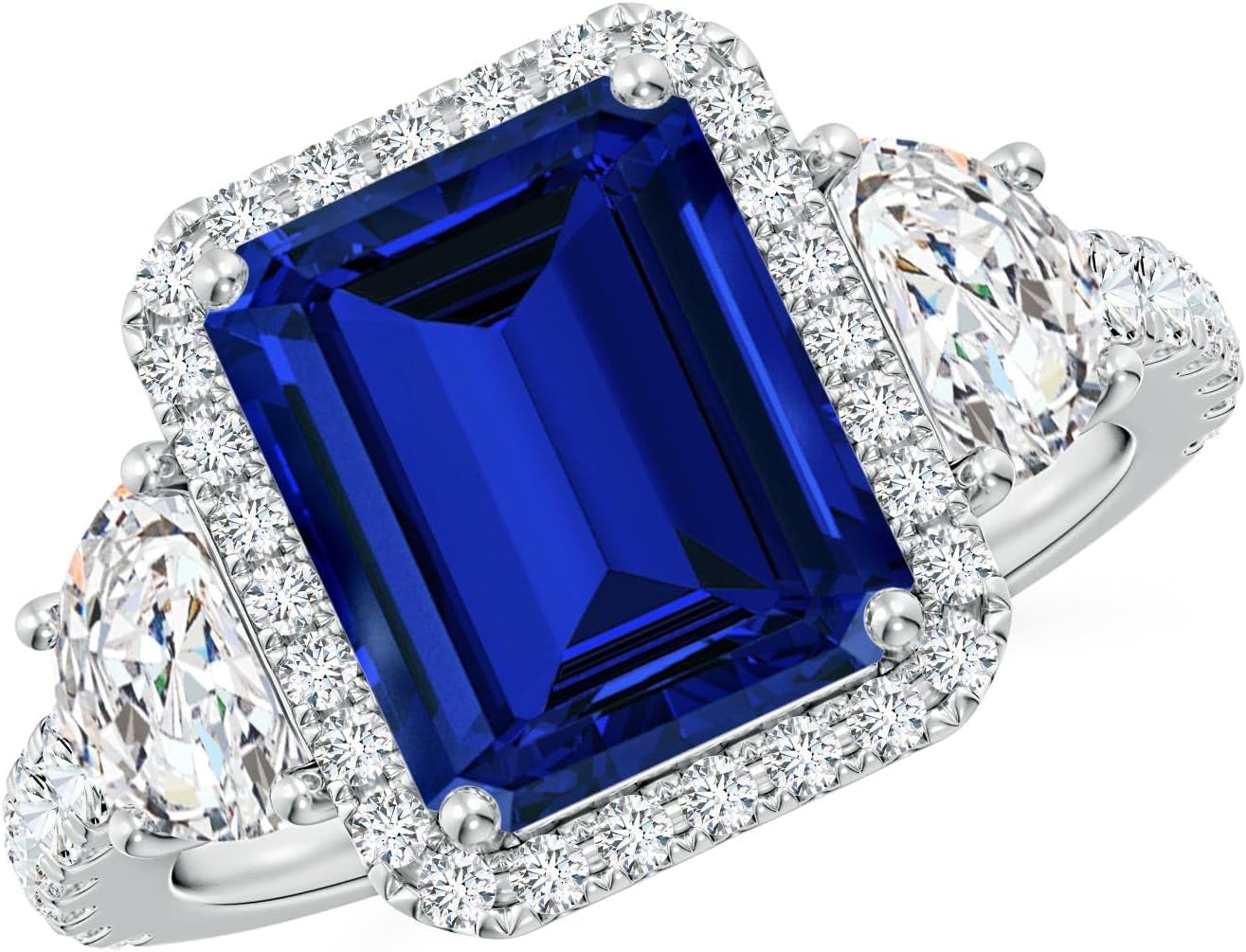 Angara Emerald-Cut Lab Grown Blue Sapphire and Half Moon Diamond Halo Engagement Ring in 14K Solid Gold/Platinum | Birthday, Anniversary, Wedding Jewelry Gift for Women