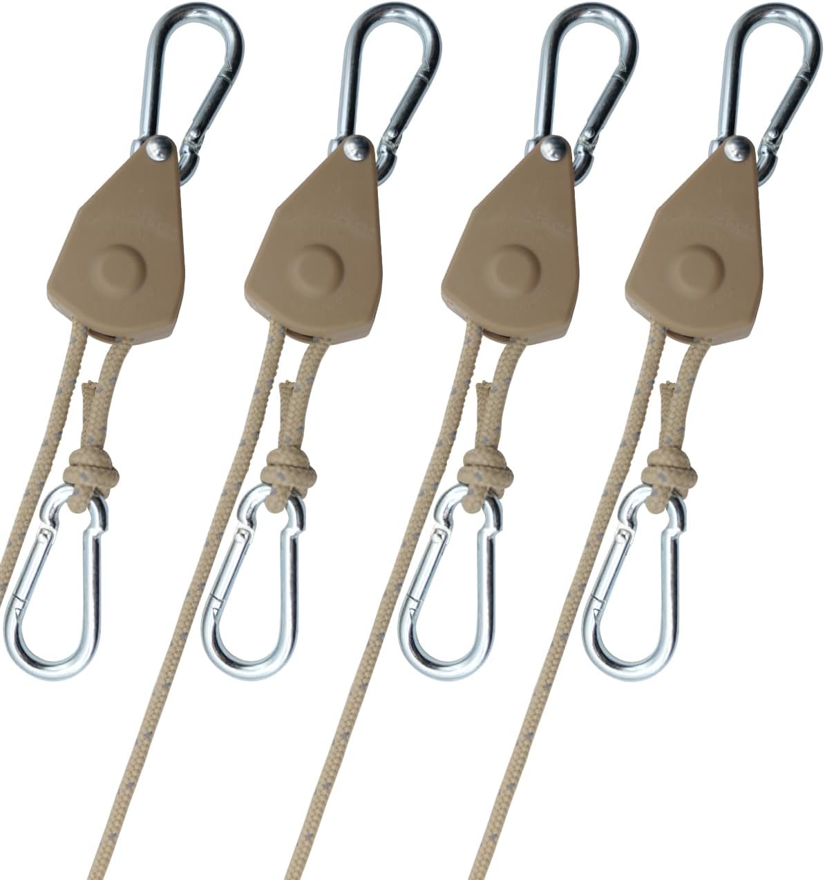 4Pack Retractable Ratchet Tie Down Straps, 13 Ft 1/8” Adjustable Rope Roller, Heavy Duty Ratcheting Pulley System with 2 Carabiner Hook, for Xmars Decor, Hanging Plants, Grow Lights
