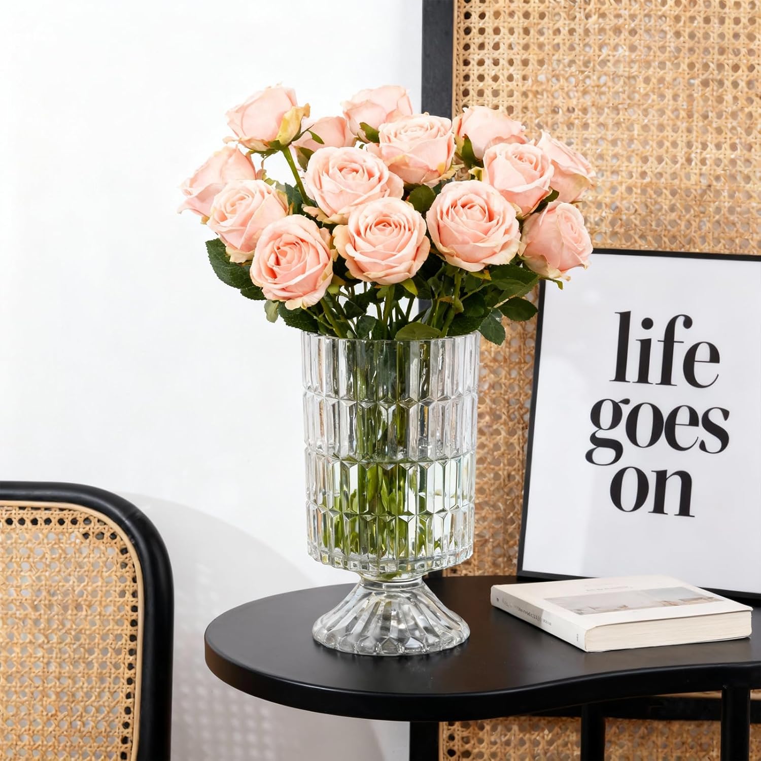 Pedestal Glass Vase, Textured Crystal Vase for Flowers, Bouquet, Vintage Transparent Vases 6.7 Inch, Decorative Flower Vases for Centerpieces, Dining Table, Home Decor, Office, Wedding, Party