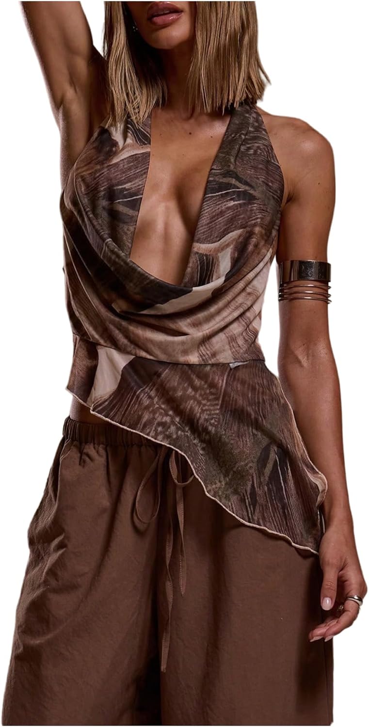 SweatyRocks Women's Boho Cowl Neck Tie Backless Halter Top Asymmetrical Sleeveless Party Tops