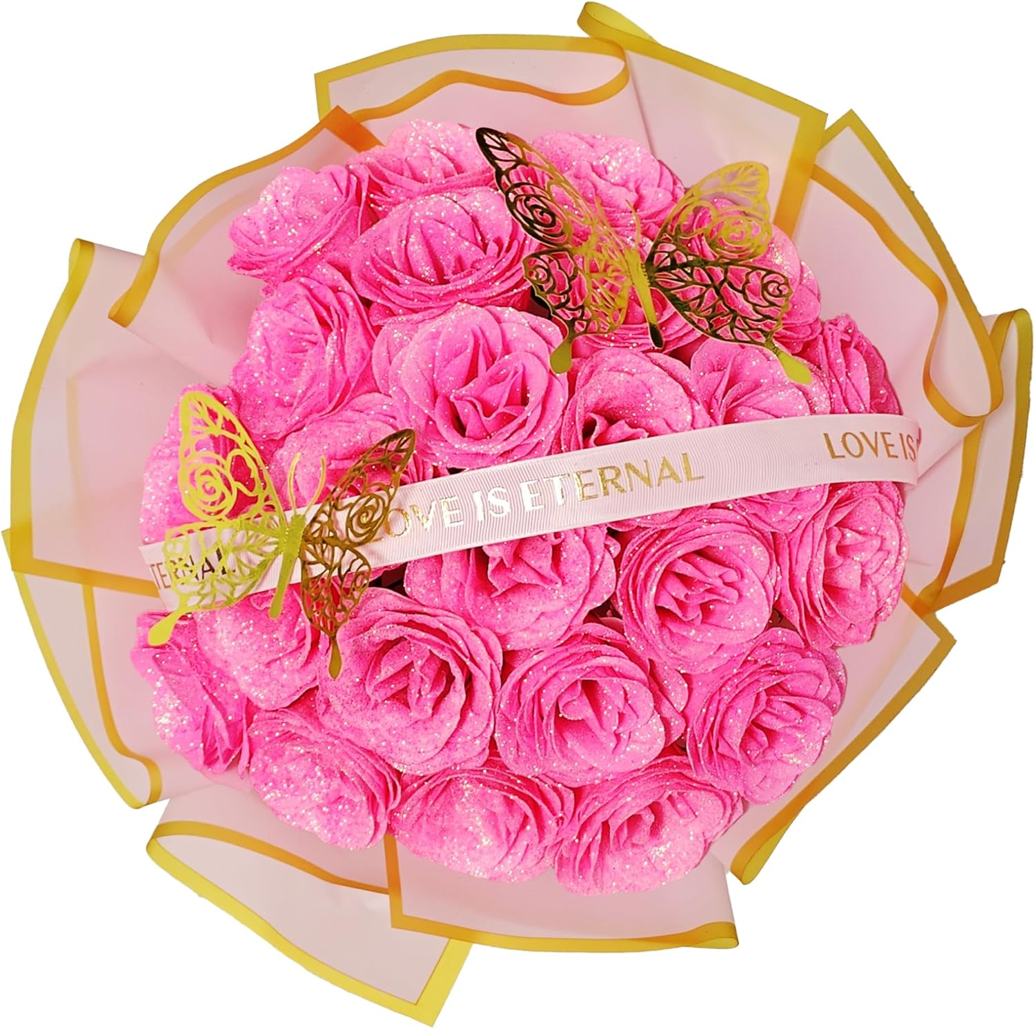 Pink Glitter Rose Valentines Flower Bouquet Gifts for Women Mom Grandma Wife - DIY 24pcs Eternal Roses Bouquet with Butterfly - Forever Rose Flower Gift for Birthday Anniversary Wedding Graduation