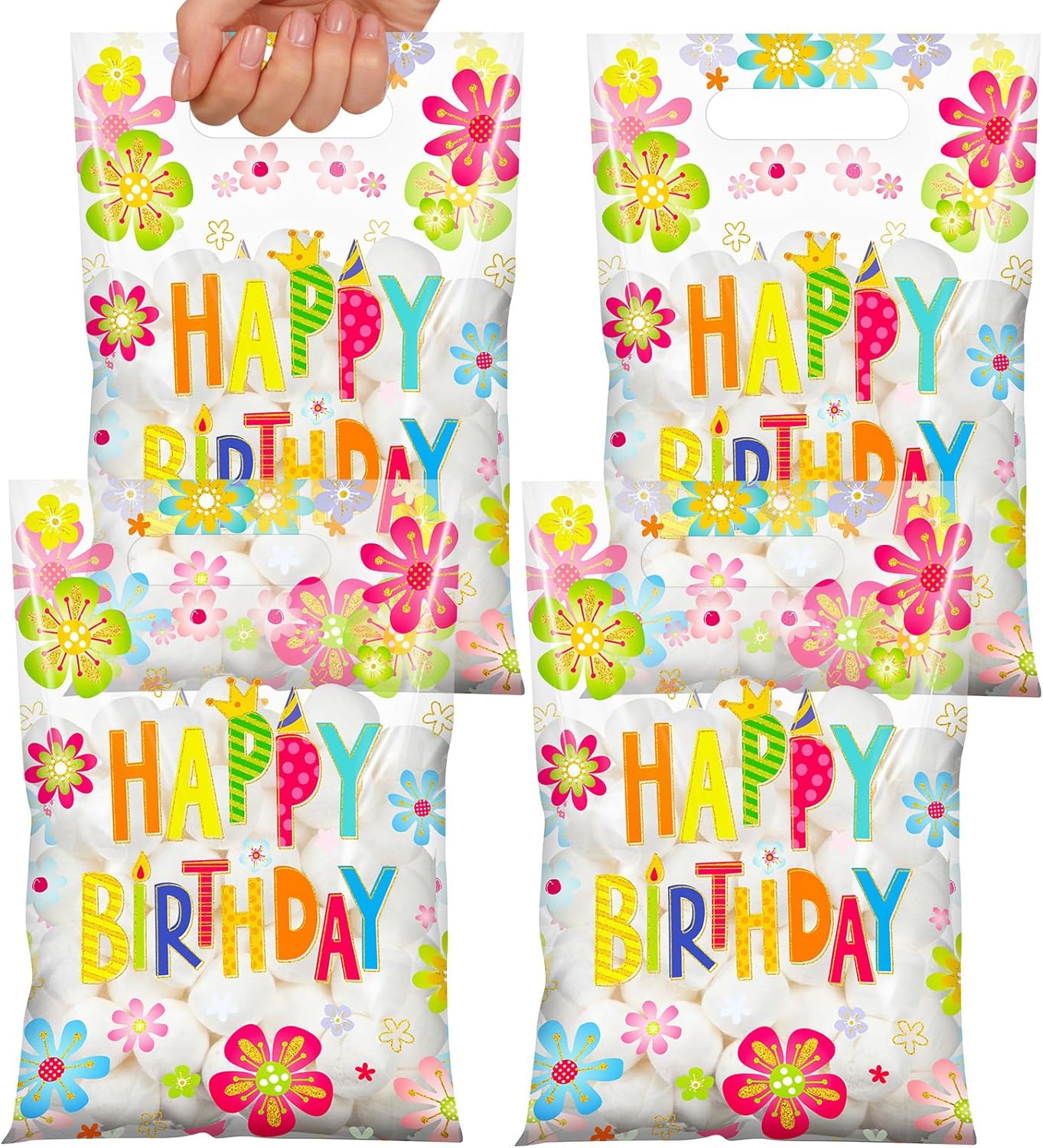 Funrous 50 Pcs Happy Birthday Favor Bags Bulk Birthday Colorful Flower Plastic Bags with Handles Clear Candy Treat Goody Gifts for Home Party Baby Shower Wrap Supplies Decoration