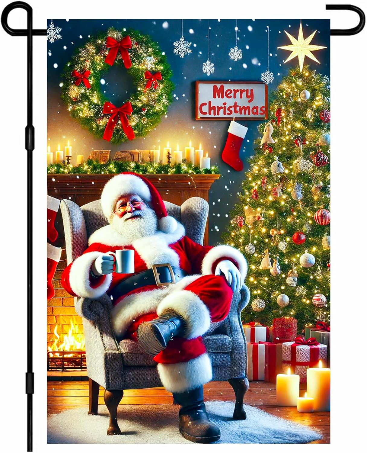 - Cozy Holiday Ambiance: Featuring Santa relaxing by the fire with a mug in hand, this flag captures the warmth and peace of a traditional Christmas evening.