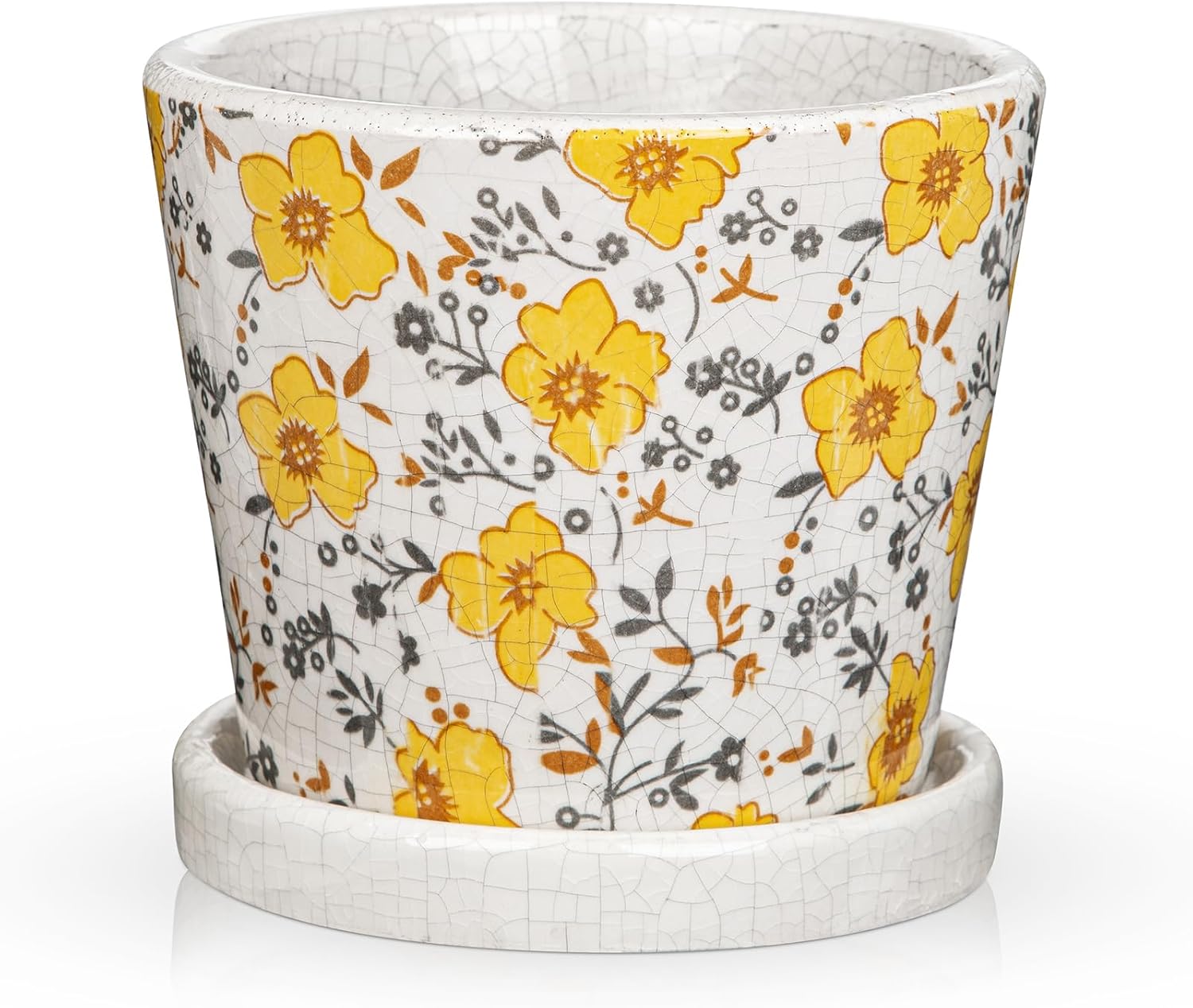 - Unique Design - This Ceramic Plant Pot features a vibrant yellow floral pattern paired with a classic ice cracked effect, crafted via superb glazing process and high-temperature firing. The exquisite surface texture (distinctive crackle details + lively flower prints) makes this indoor plant pot visually stunning, while its versatile style seamlessly complements any home décor (modern, rustic, bohemian, farmhouse, etc.).