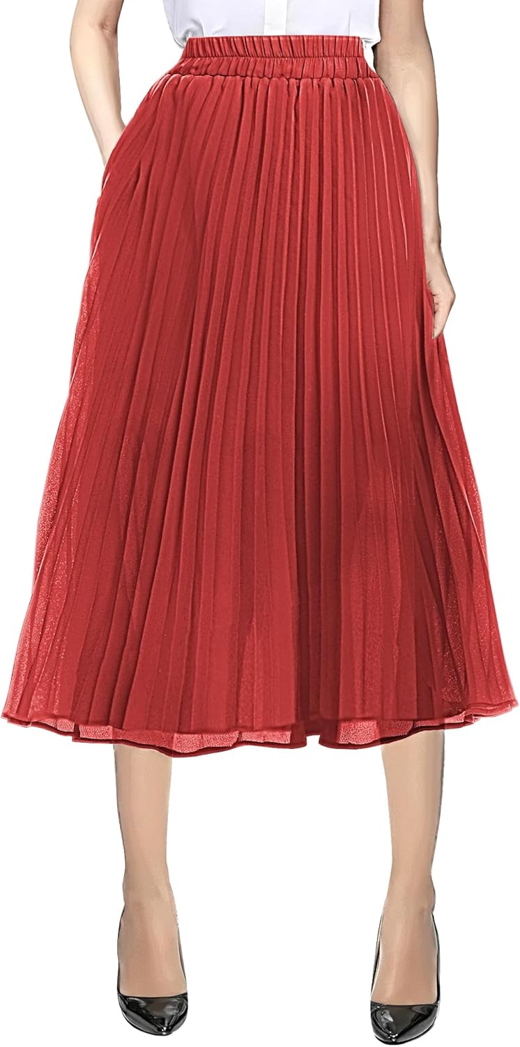 Urban CoCo Women's A Line Elastic Wasit Chiffon Midi Skirt Flare Pleated Skirts with Pockets