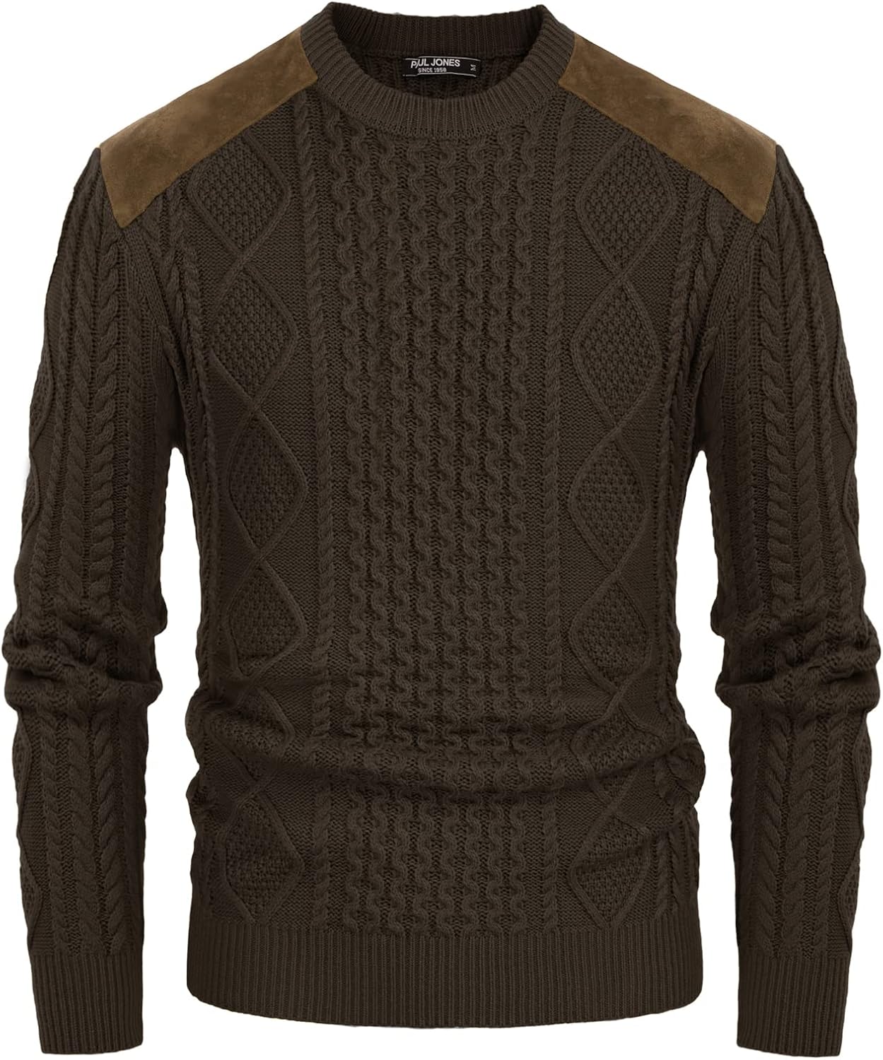 PJ PAUL JONES Mens Sweater Military Cable Knit Crewneck Vintage Long Sleeve Pulllover Sweaters with Suede Patchwork