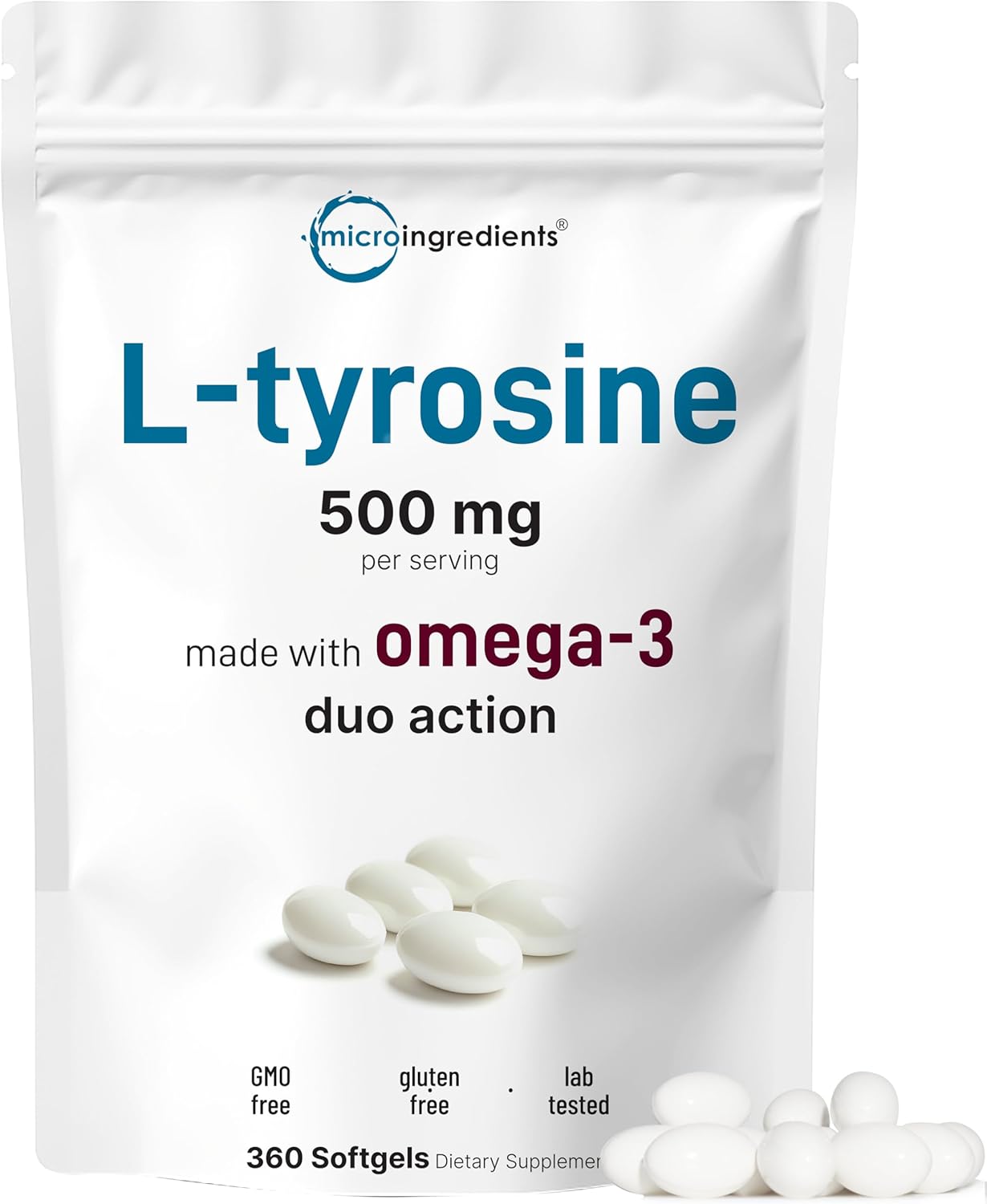 - Micro Ingredients offers a duo-action L-Tyrosine softgel formula combined with omega-3 from flaxseed oil, delivering 500mg L-Tyrosine per serving with 1,000mg flaxseed oil that naturally provides 500mg alpha linolenic acid (ALA).