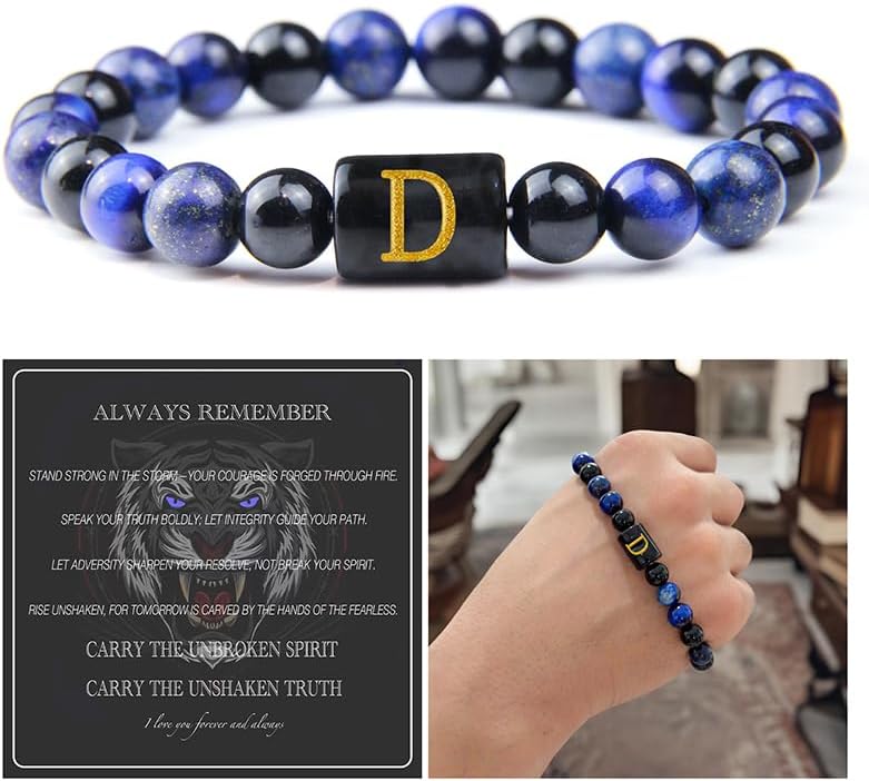 Initial Bracelet for Men - Blue Tigers Eye Lapis Lazuli Obsidian Triple Protection Bracelet 8mm Beaded Bracelets for Men, Christmas Anniversary Birthday Valentines Gifts for Dad Son Husband Boyfriend Brother